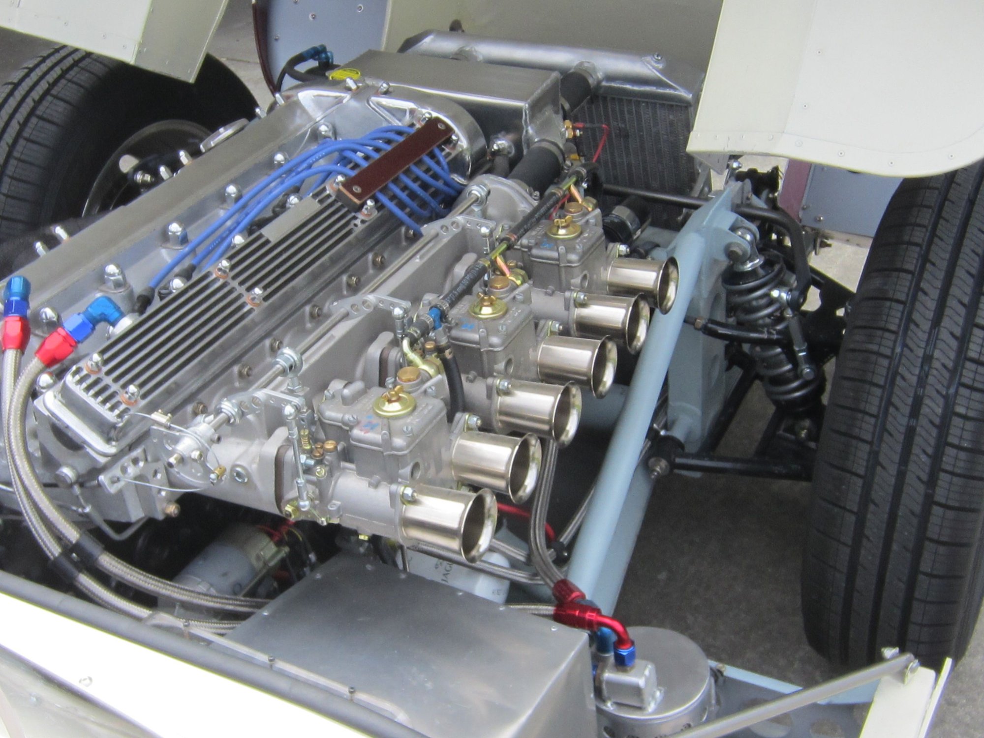with stock E Type cams. .Light weight aluminum fly wheel coupled to a T5 Ford Mustang 5 speed .Rear drive is a BMW 700 series limited slip unit with Nissan 300ZX inboard caliper, CV joints and a Lister style deDion axle.