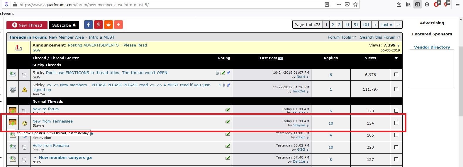 The green tick (known as check in the US?) to the right of the thread shows I'm subscribed to it. The next gray shaded box shows the last post in the thread is by you made at 01:09 AM my time zone. Replies 10 = total number of replies to the thread and Views 134 at the far right = the total number of individuals who have viewed the thread (could be multiple times)