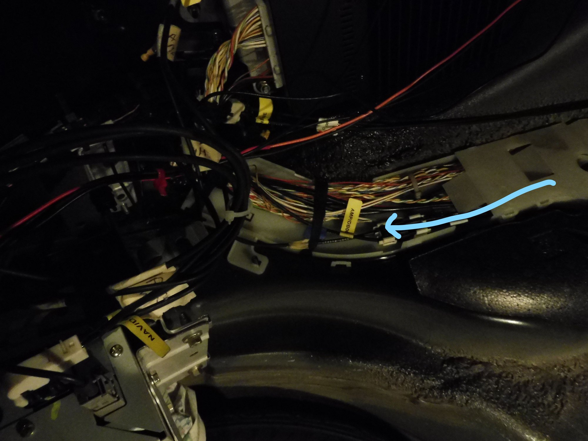 The NAV unit is where the video signal for the screen comes from and where the touch screen sensors go via the electrical connectors, and the amp is needed to power the speakers, again via the electrical connectors. So start with these two only in the loop and disconnect the electrical connections from all the others.