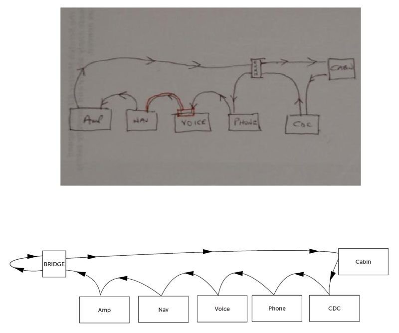Mellow, I did the routing a tad different than your diagram where I put the bridge at the end of the loop. This was the best way to do the setup with the length of the wires and the loop is currently ending at the bridge (see my image in one of my earlier posts). When I turn on the stereo, I have no sound out of the radio, the CDC doesn't work, and I still get phone not fitted. Is it mandatory that I go exactly in your order? Please see your diagram vs. mine below.