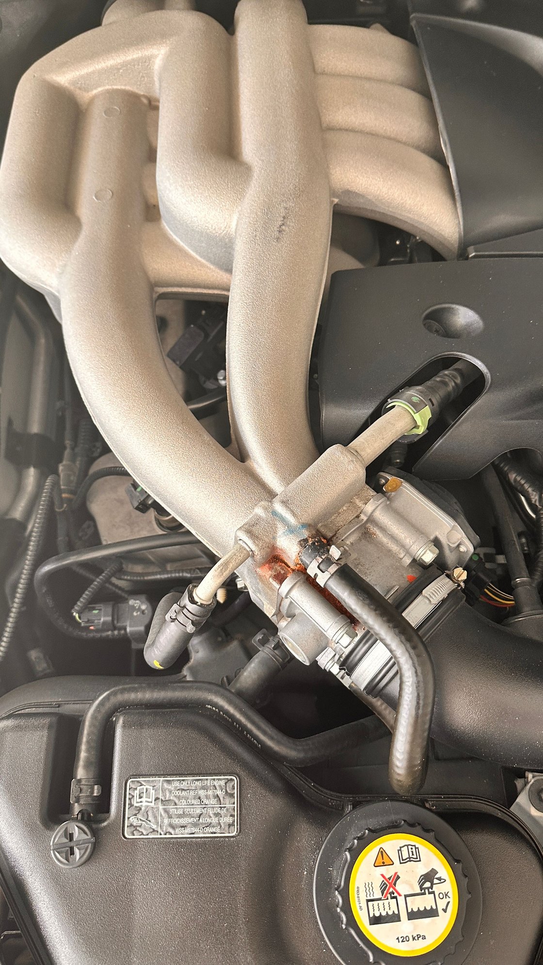 And there would be a lot of crap stuck on the inside of you connecting hose there: Clean that out thoroughly When all is finished, put the clamp back on AND add a second hose clamp. Check coolant level and refill with the correct coolant. Red coolant would be correct - check it has the right spec. Ford Spec WSS M97B77. You could also use a certain yellow coolant, but I don't want to confuse you too much - I wrote a thread about it: