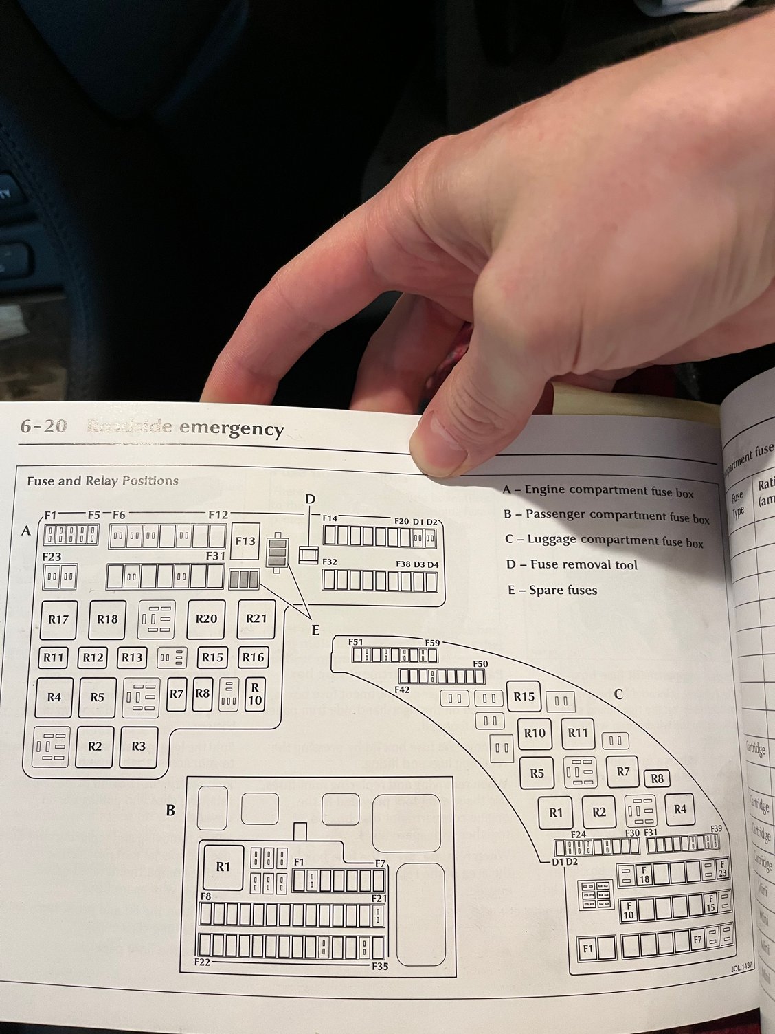I looked in the luggage compartment in the trunk and I'm currently looking where to get a replacement micro 20A fuse for position R10. It's this large square yellow thing.