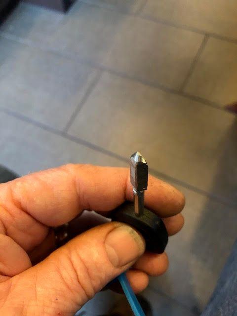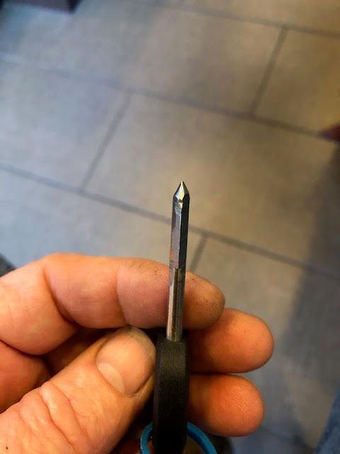 2) I was put in touch with Craig at The Jag Shop in Portland Oregon regarding the problem of not being able to fully insert either key into the door. He suggested the tumblers were probably misaligned and gummed up from lack or use. It seemed possible to me, who ever uses their key when they have a fob? I bought a key from ebay and ground it as he described (photos below). Low and behold I was able to eventually wiggle it all the way into the door lock. I also used a little dry graphite powder, now both keys work in the door! $30 US.
