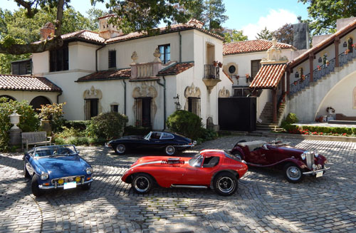In Vanderbilt Mansion courtyard, from left: 1967 MG, 1966 Jaguar XKE (rear),1965 Cheetah, 1952 MG TD