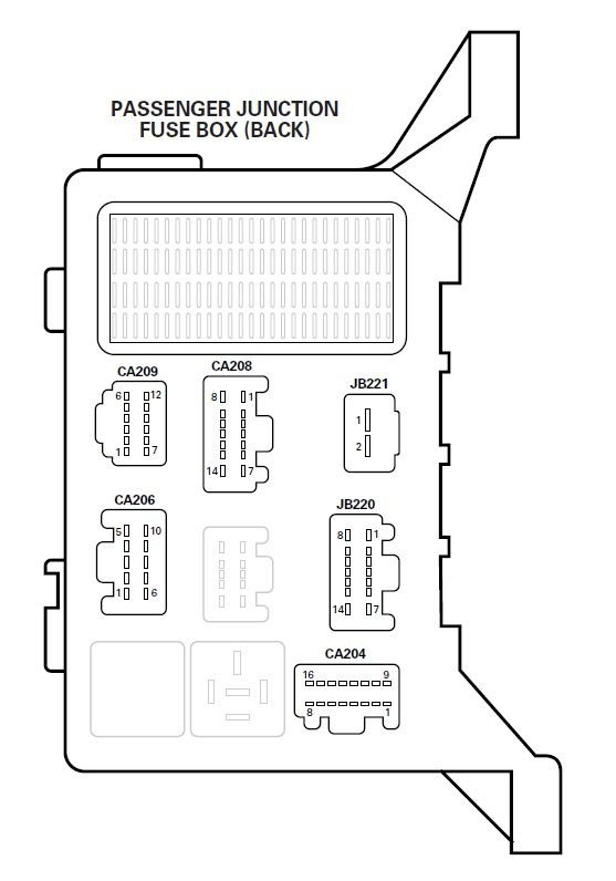 To do that you will need to locate connector JB220, the 14 pin plug in the back side of the passenger junction fuse box.(image inserted below)