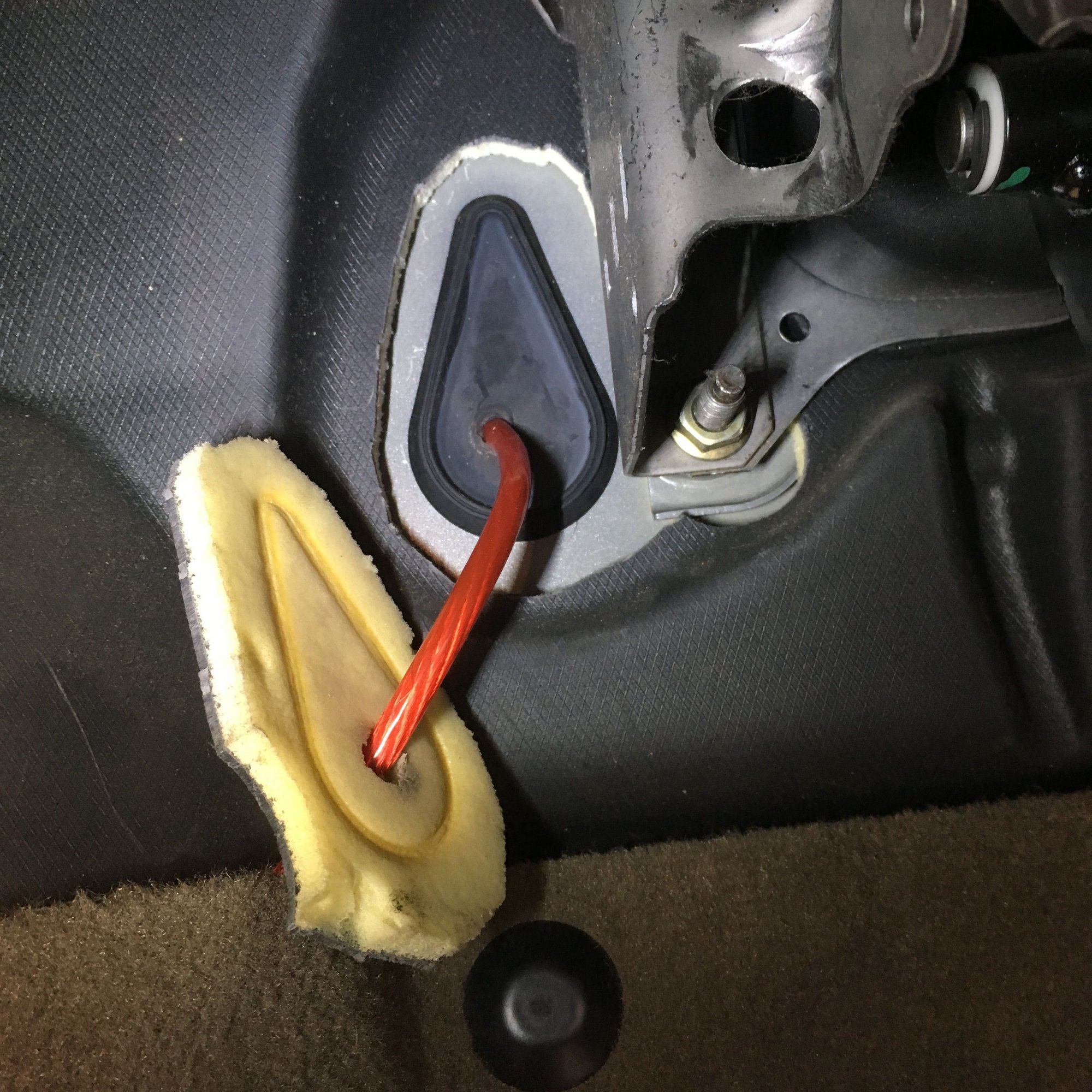 To find it, look at the insulation mat just above the top edge of the carpet in the footwell, to the left of the brake pedal. There will be a perforated section which you can remove to access the 3" grommet in the firewall. Drill a hole through both and replace the cutout over the grommet for a better look and noise insulation.