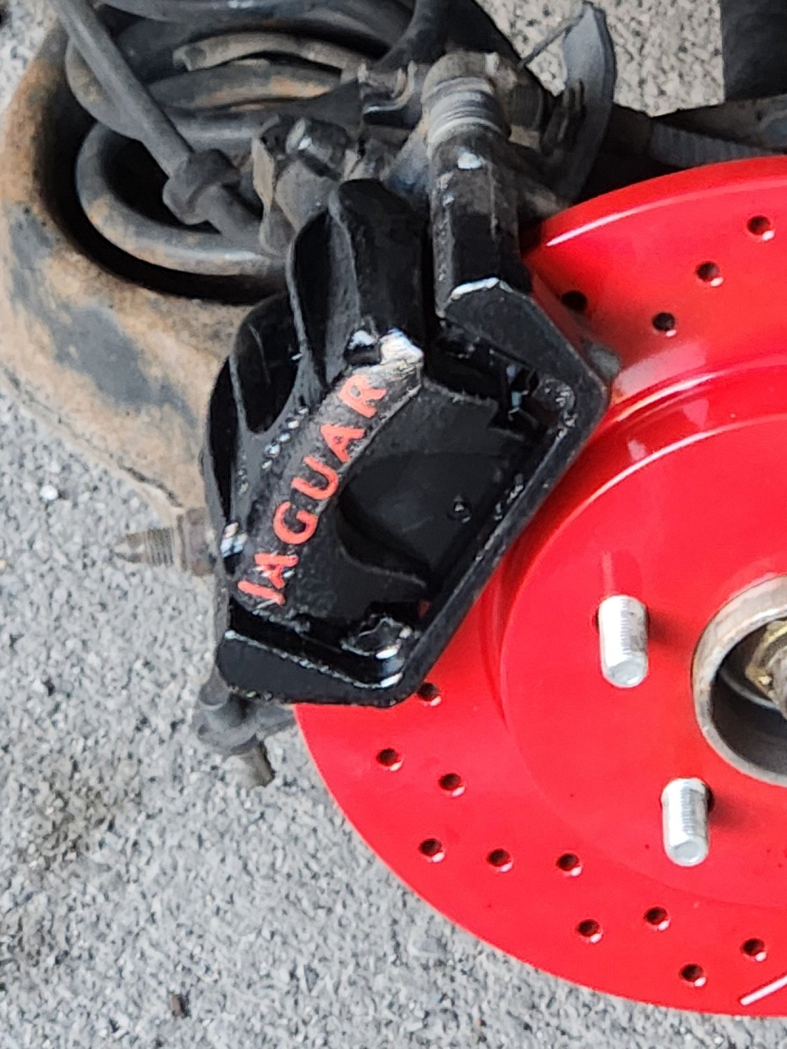 New anodized rotors, painted calipers w/added Jaguar Logo, New kevlar/ceramic brakes. Only took my fk*ed up cancer body 3 days, lol.