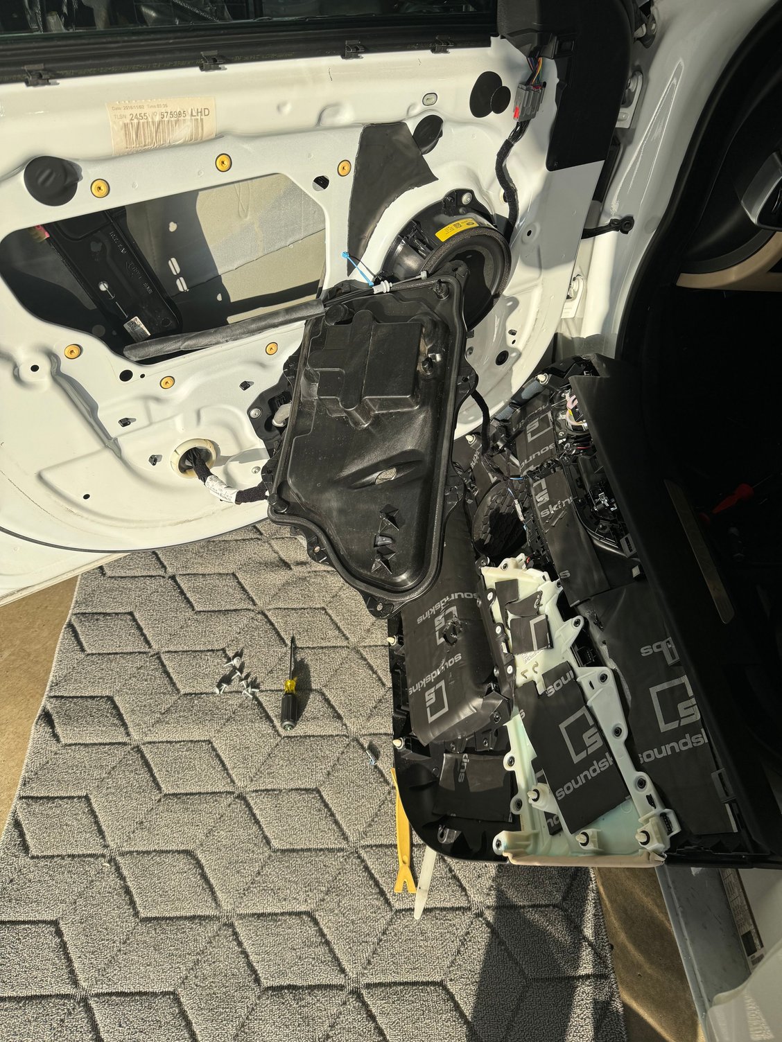 Removed the trim panel again (already had it off for sound deadening) and removed the inspection hatch on the inner door structure. Happy to see it didn't have adhesive but just a bunch of broad headed screws.