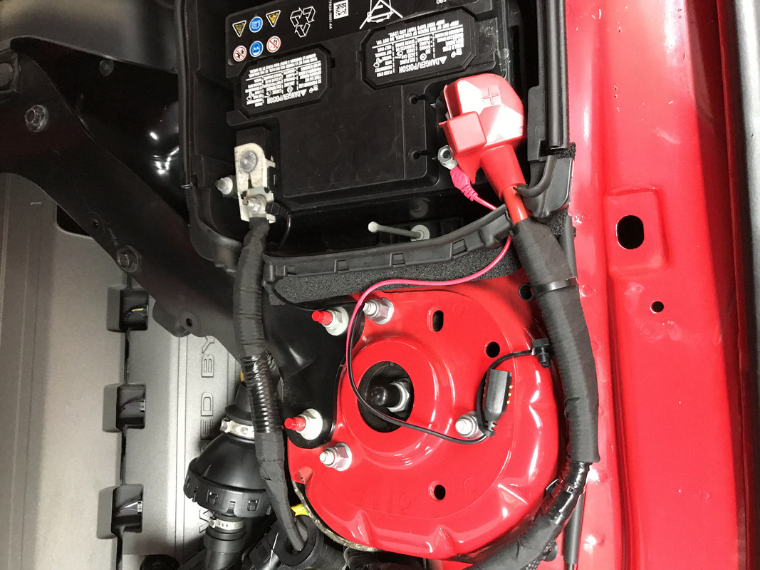 I then fed the pigtail end out under the side of the car and tucked it up under the edge of the bonnet/hood in a spot where it doesn't fall out but is easy to flip out when needed. I can now connect my tender/charger in 20 seconds flat without opening anything or even needing to unlock the car!
