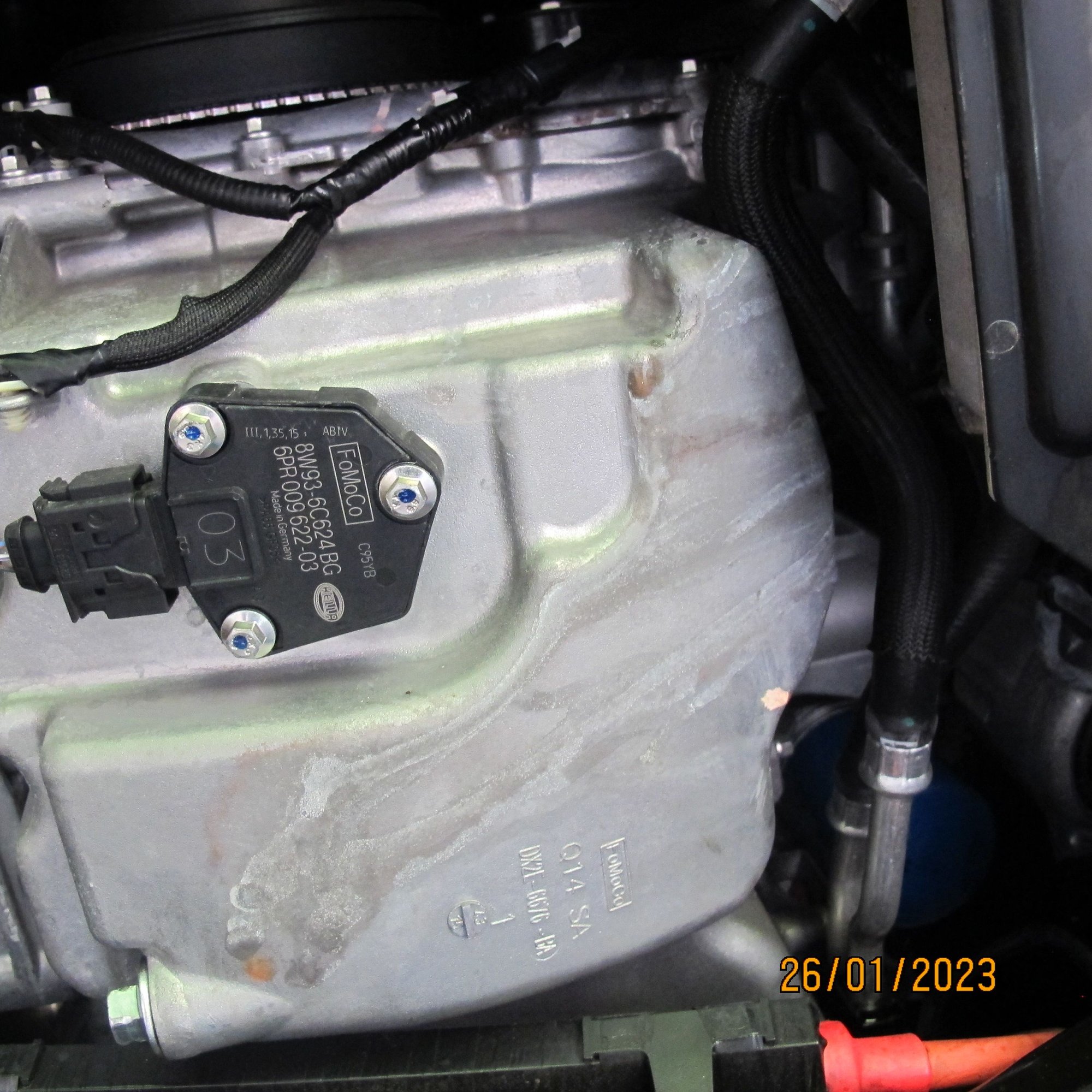 The pump looks brand new, the O ring is good, but the shaft seal is obviously stuffed. It is FoMOCo 157G/EJ7E stamped on the pump, but no direct Google hit. There was a hit of what might be equivalent pump used on Ford, Volvo and other engines at GBP40. It looked the same. I will squeeze JLR for a freeby seeing they may be sensitive about their reliability reputation, otherwise try a Ford replacement from Ebay or whatever. The money is not the issue, the issue is a car that cost AUD110,000 6 years ago should not have a pump fail at 17,300km. This is not normal wear and tear. Still, they do make mistakes in the factory which is understood, but if it is made good with minimum inconvenience to the owner then reputations are kept intact. Pump high in the engine, easy to get at, good one Jaguar. FoMOCo water pump for 2L petrol engine FoMOCo water pump for 2L petrol engine FoMoCo sump casting. Is this a Ford or Jag engine ? You can see orange trace from coolant leak, been there well before last service I bet.