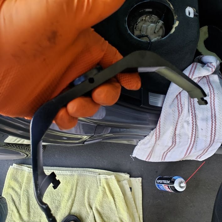 Thanks. The fuel cassette resides under the back seat, passenger side, clean it off before you open it. You'll need to be down to at least 1/2 a tank or less, before opening this. Keep a fire extinguisher handy. The electrical connector unlocks from the bottom, so you'll need a small hook or screw driver to lift up it's locking tab. I marked the flange as to re install it in it's same orientation. USE THE RIGHT TOOL FOR THE JOB! It takes considerable force with this tool to unscrew the flange retainer, I used a 1/2in. breaker ratchet. IT CANNOT BE REMOVED WITH A HAMMER AND PUNCH! It's tangs lock into the flange retainer. The leaker, just a hairline crack, once the retainer is unscrewed the flange just lifts off exposing the green flange seal and fuel pump assembly The new flange goes in, reverse of how the old one came out, and it only fits correctly one way, you'll need to make 2 fuel line connections that can't be mixed up due to them being different sizes, and 2 electrical connections. Don't forget to replace the green flange seal, and that's it