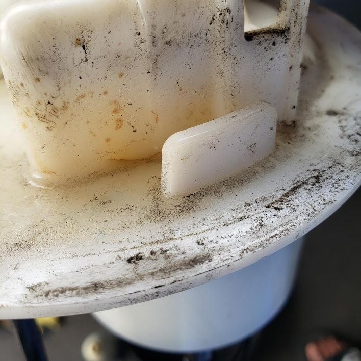 Started a gas smell on the passenger side when the car sat. The fuel cassette resides under the back seat, passenger side, clean it off before you open it. You'll need to be down to at least 1/2 a tank or less, before opening this. Keep a fire extinguisher handy. The electrical connector unlocks from the bottom, so you'll need a small hook or screw driver to lift up it's locking tab. I marked the flange as to re install it in it's same orientation. USE THE RIGHT TOOL FOR THE JOB! It takes considerable force with this tool to unscrew the flange retainer, I used a 1/2in. breaker ratchet. IT CANNOT BE REMOVED WITH A HAMMER AND PUNCH! It's tangs lock into the flange retainer. The leaker, just a hairline crack, once the retainer is unscrewed the flange just lifts off exposing the green flange seal and fuel pump assembly The new flange goes in, reverse of how the old one came out, and it only fits correctly one way, you'll need to make 2 fuel line connections that can't be mixed up due to them being different sizes, and 2 electrical connections. Don't forget to replace the green flange seal, and that's it