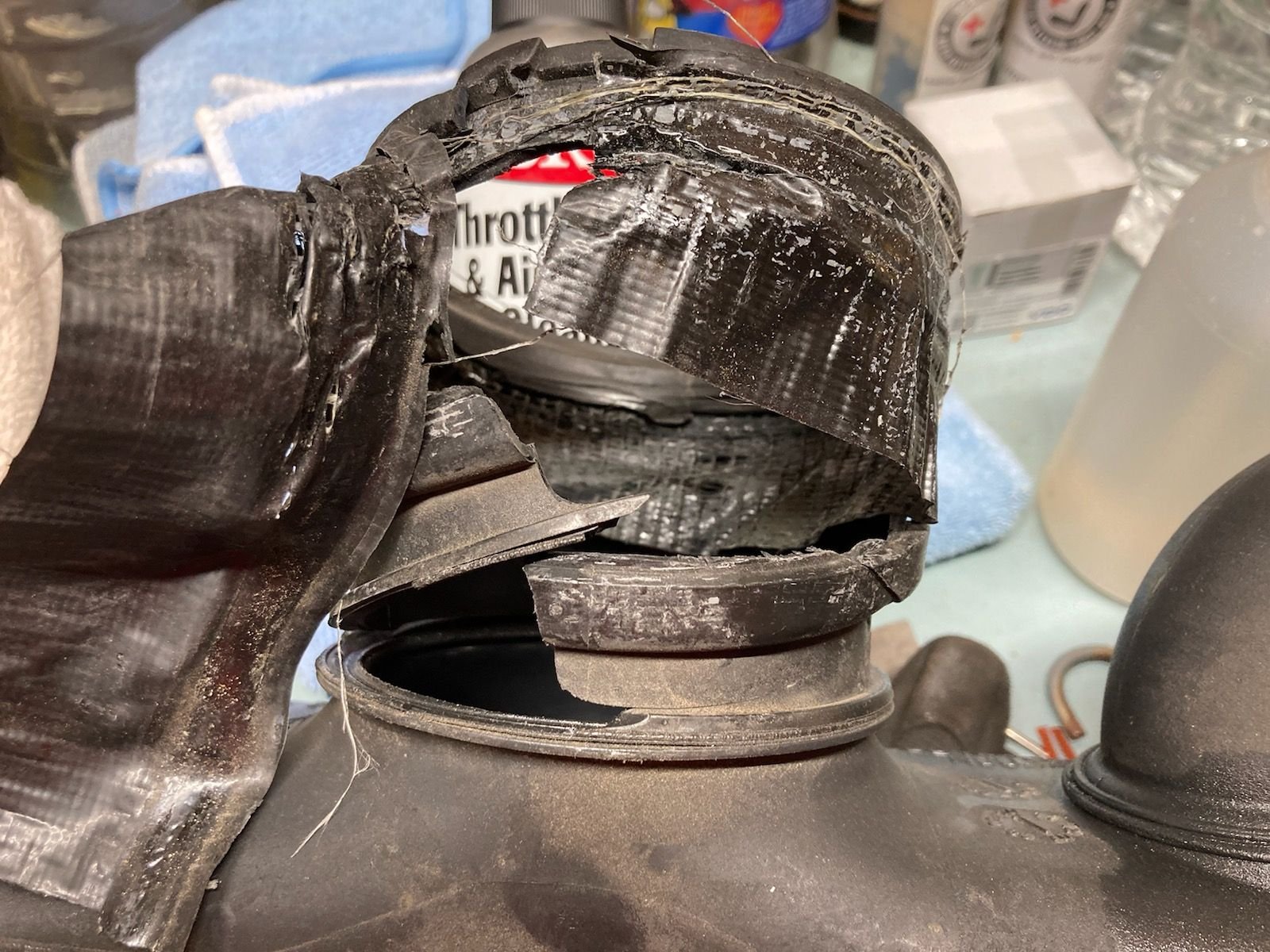 It was stuck at the throttle body so tore a little more getting it off, but it was very bad to begin with. And yes, that duct tape was the previous owner's version of a fix.