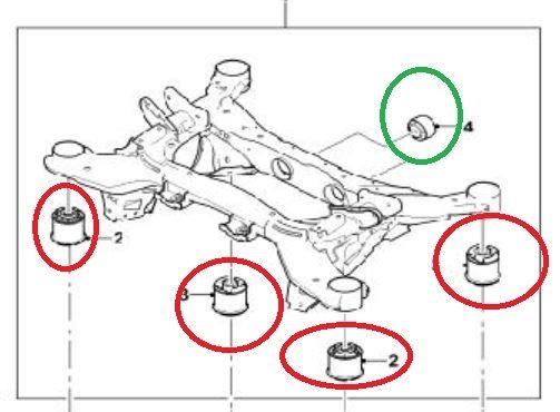 The red circles are the 4 subframe bushings. The green circle is the 2 differential to subframe bushings and I find again in JPART that they list them separately?