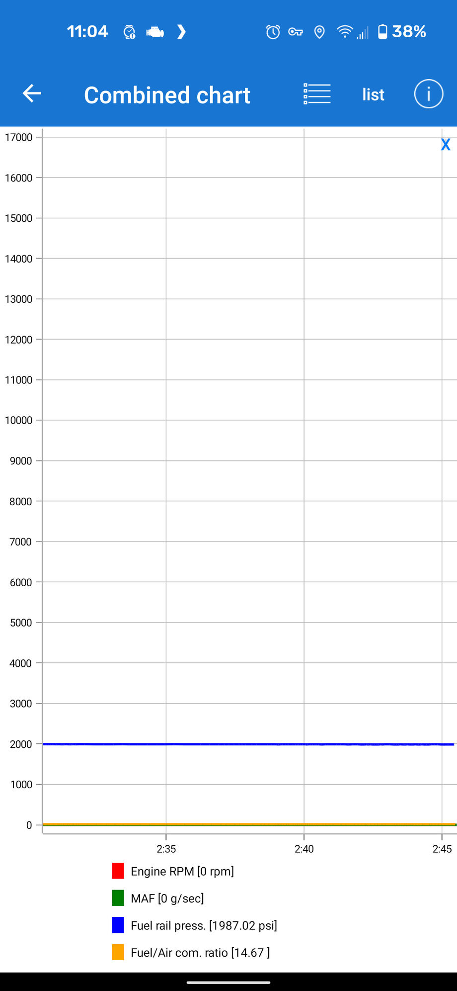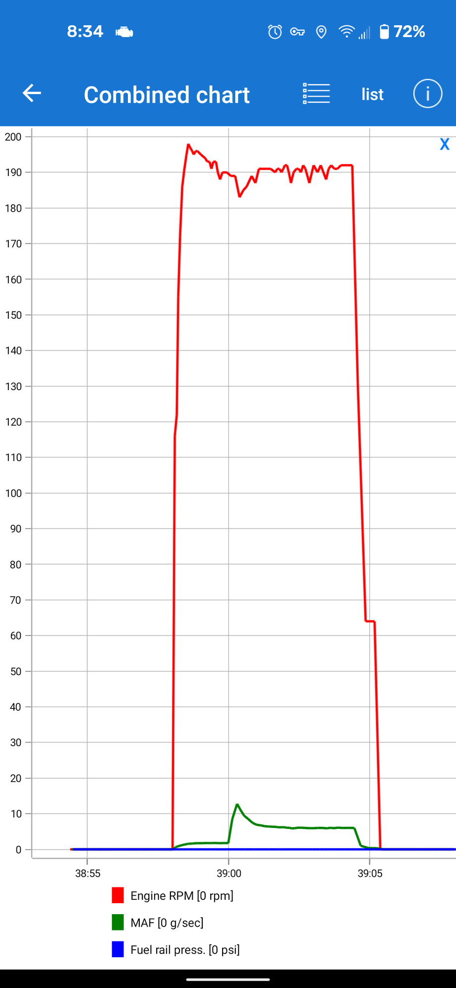 Continuation from the last screenshot. I changed active sensors to the fuel rail pressure. Once it had been idling for a minute, I gave it a little gas. It started to go up, then died.