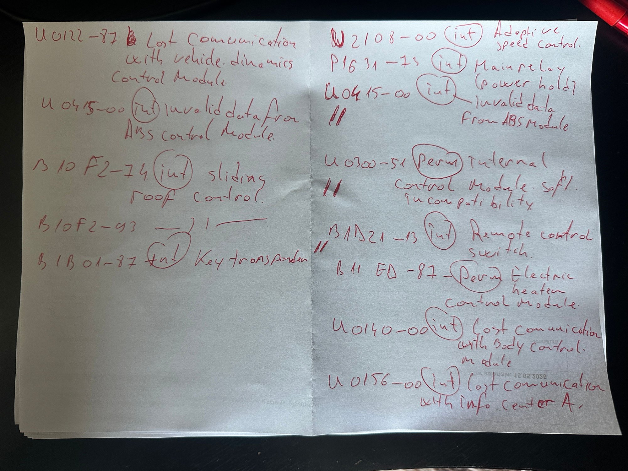 Interior lights flickering, jittery steering wheel, battery drain, car doesn't lock, alarm starting randomly in the morning when the sun heats it, a bit of jittery start sometimes, sunroof malfunction…. . All random with some errors that are intermittent! As you will see on the picture with the scanned errors, intermittent means int, abbreviated on the list.