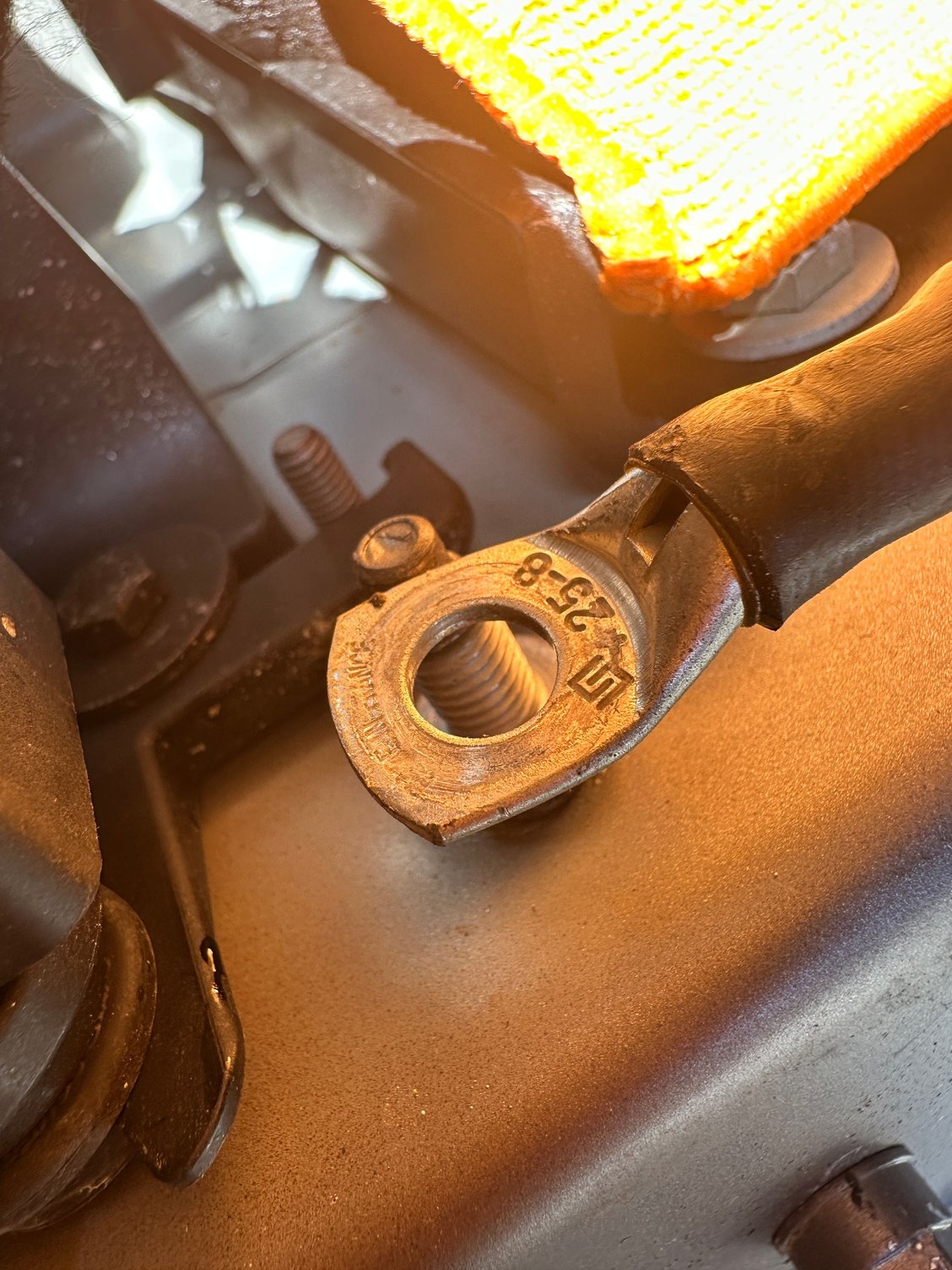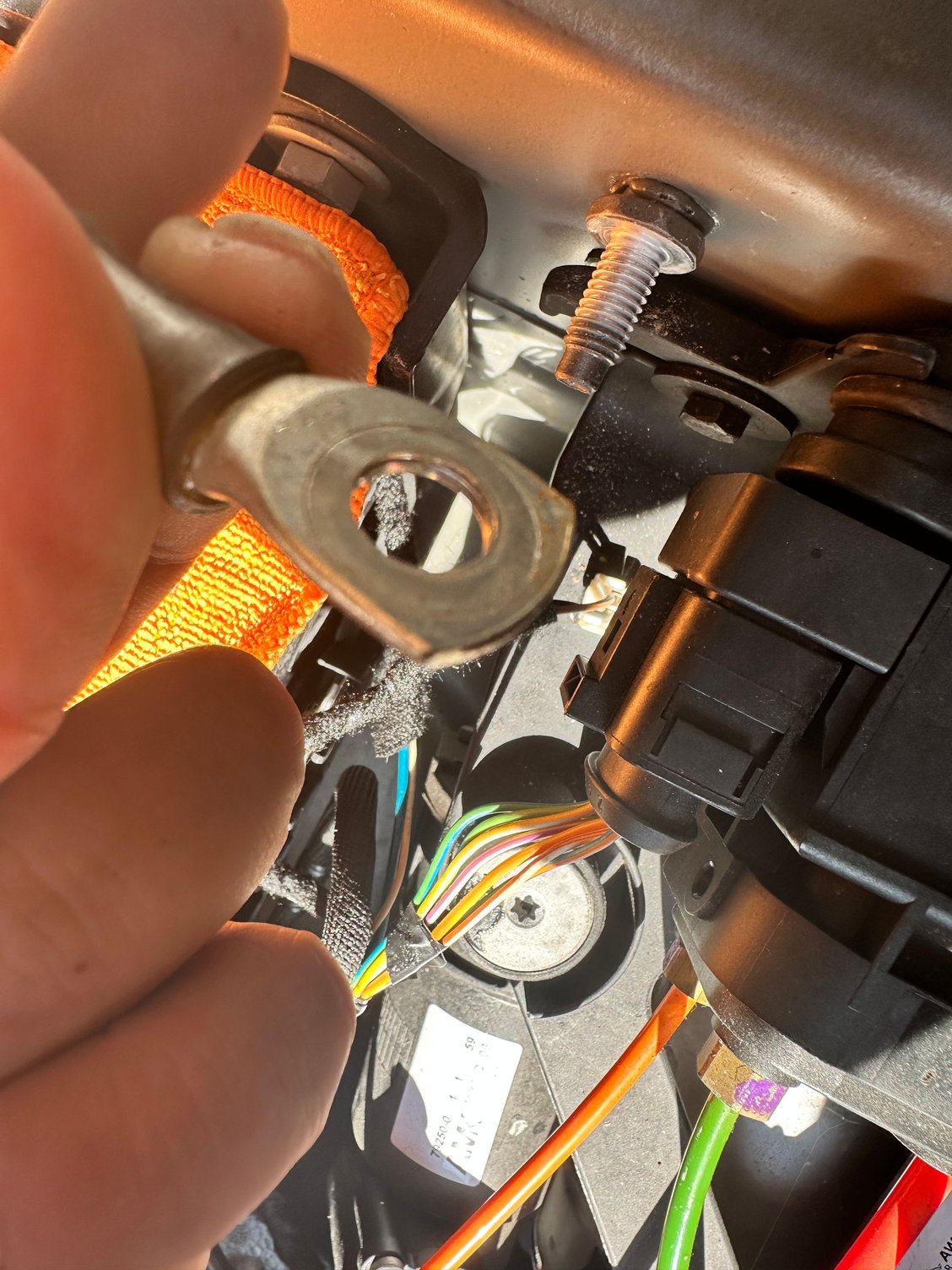 So….no green corrosion until now. Just that screw and connectors ware, a bit white, not metal grey clean. Some verry fine….. White ish coating on them. Connectors on the other hand, being not aluminium and grey, after clean an re surfacing with sandpaper looks shiney and new. The one from the info center A, in front at the engine on the passenger side ware the dirtiest. Screw, connectors and even the bolt was a bit rusty exactly ware the thread starts and ware the connectors sit!