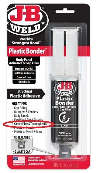 The part that broke off was a hard plastic that holds the inner rubber grommet. So I was gluing hard plastic to CF.