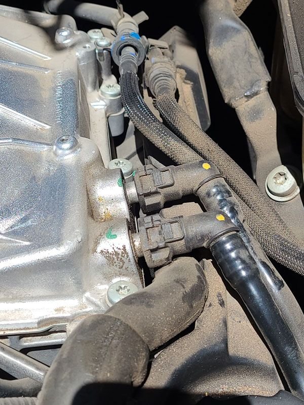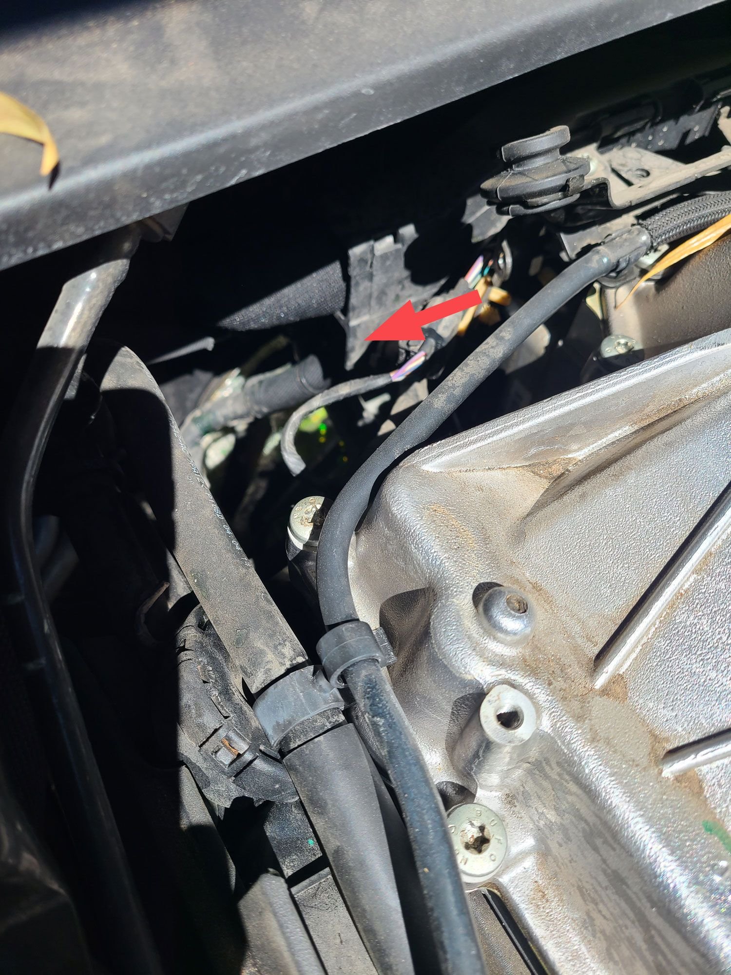 Coming out from behind where the arrow is. Possibly the hose that is inline with the arrow? Back of engine, right side,