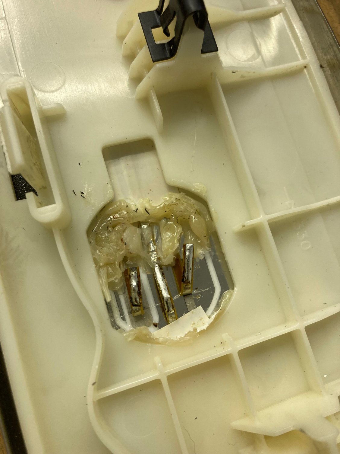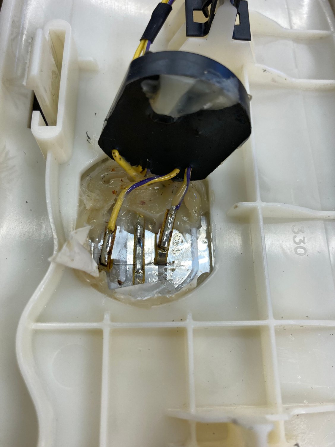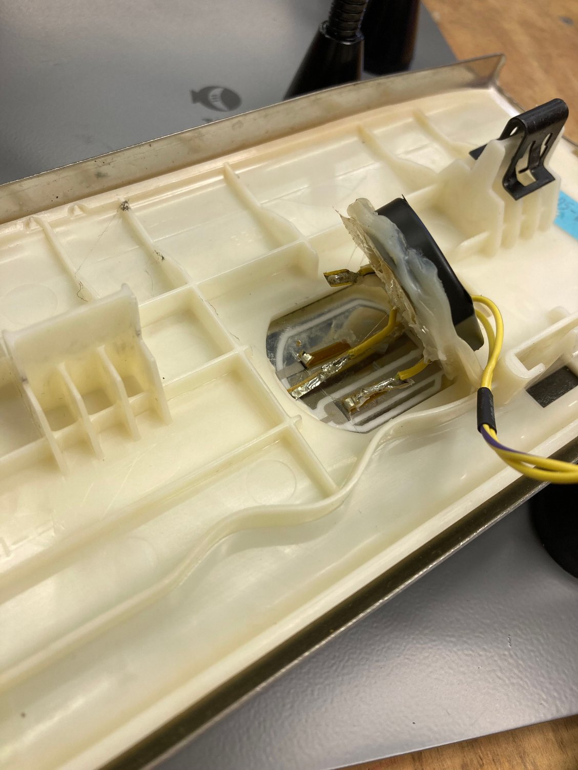 My foil tape ripped right where the large white plastic bracket (that has the clips that actually attach the treadplate to the car) is adhered to the plate itself. To access a fresh length of foil tape on which to make a new connection, I had to split the plastic housing by prying it away from the plate using brute force. I soldered new connections to the actual electroluminescent tape (carefully to avoid burn through) and re-adhered the treadplate to the mounting bracket using new double sided tape after cleaning it up.