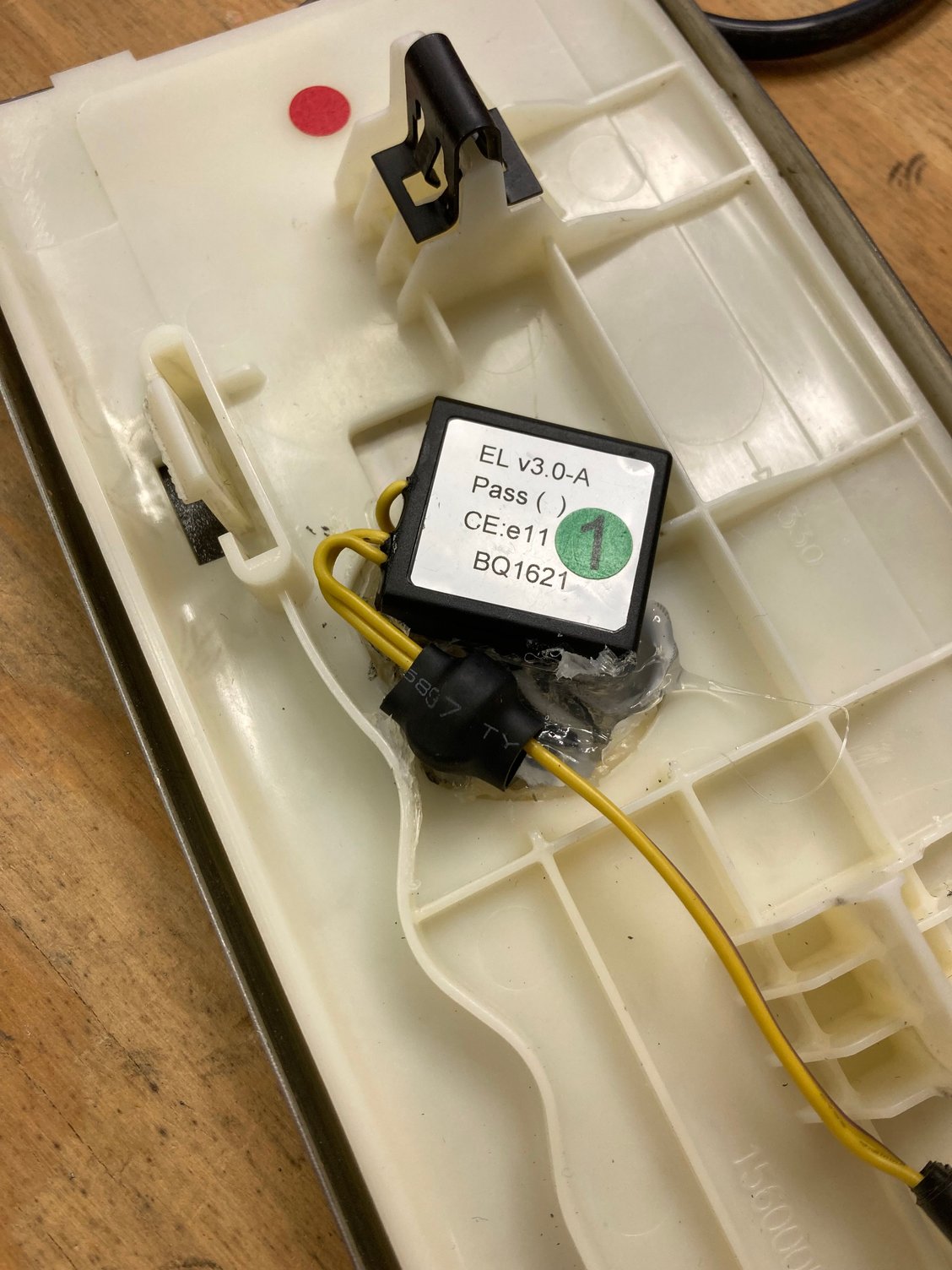 Be VERY CAREFUL with the foil tape. Handle it like you would handle an improvised explosive. After ripping two of the foil tape connections I was much more careful with the third. To extract this from the hot-glued mess of the factory EL driver, I heated up a flathead screwdriver blade with a torch lighter and used that to gently melt and prise away the hot glue and wiring.
