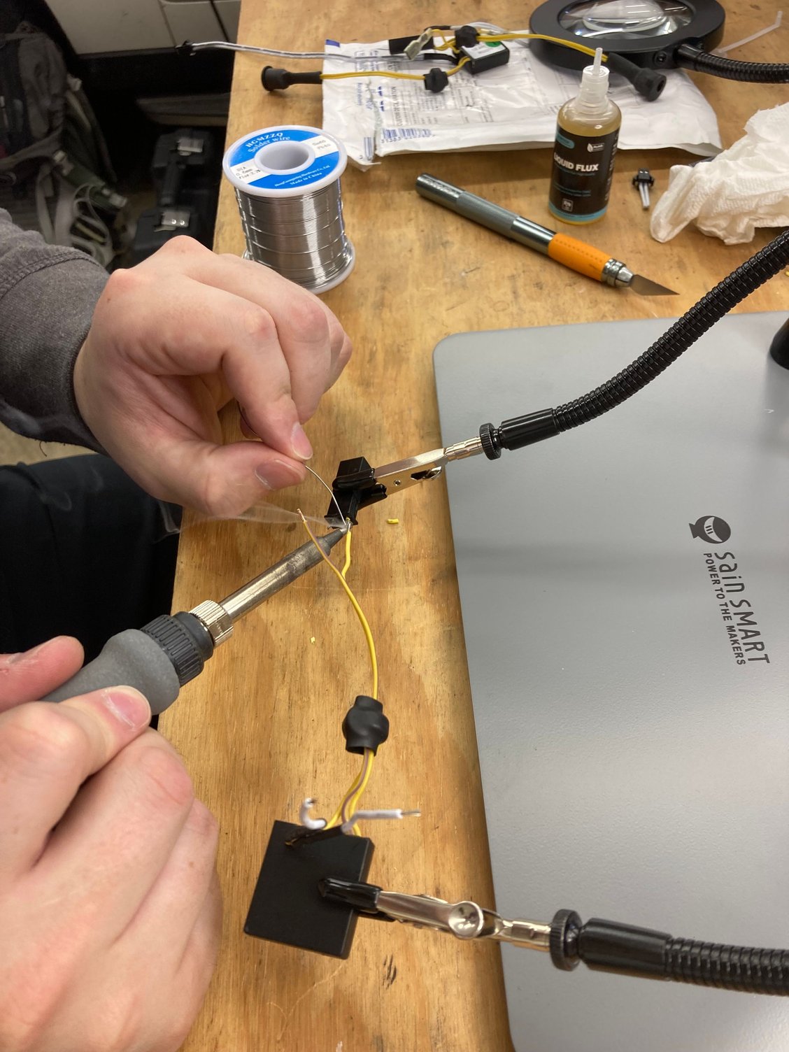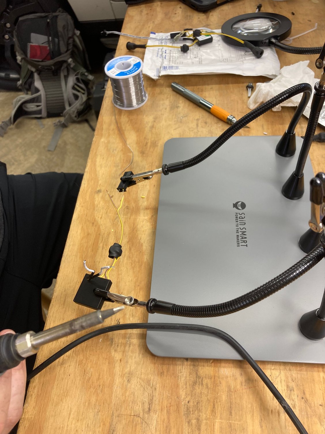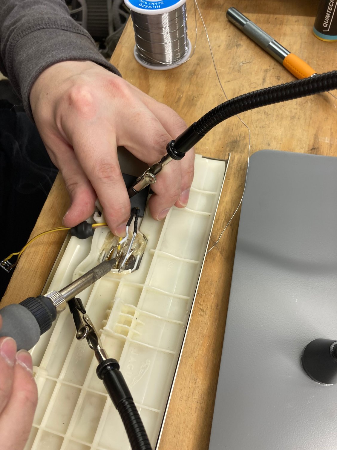 2. Use a hot glue gun to resecure any resoldered wires or the inverters themselves. Keeps you from having to reuse the wax and once glued down you get structural strength with each join