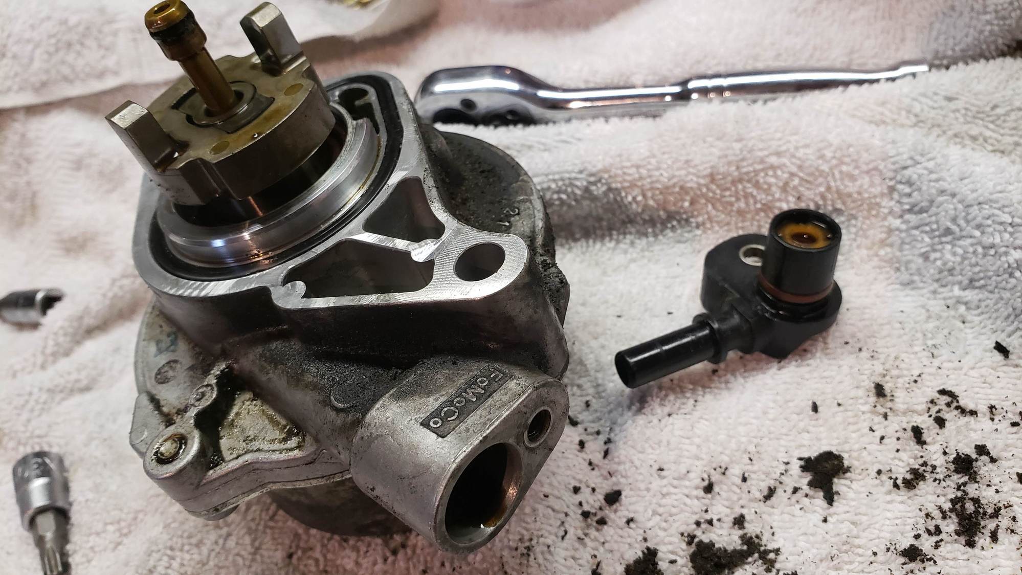 clubairth1...thanks so much. Odd place for a vacuum pump....but if I track the hose I think it makes it all the way to the booster. The leak is coming from the where the black piece meets the metal housing, not where the black piece meets the hose and connector. Is there an o-ring in there? There is a T27 screw that appears to attach it and it is tight. It does not looks like it is worth the trouble to bring it in. The whole assy as you mentioned is connected via two screws. I imagine it will dump most of the oil if any of these parts are removed?