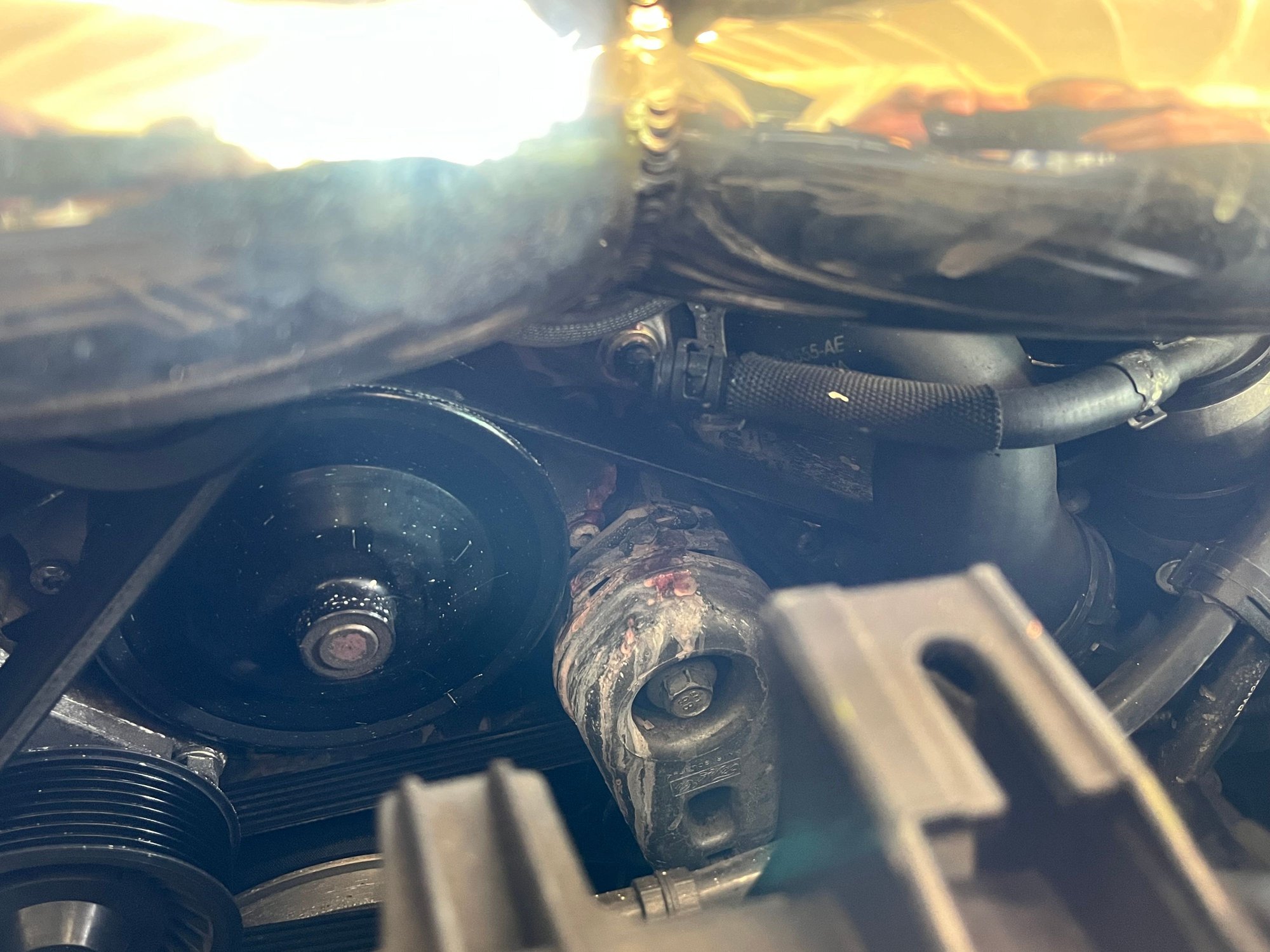 See the pic? Above the top of the belt right under the intake tube - that brass colored inlet is leaking coolant.