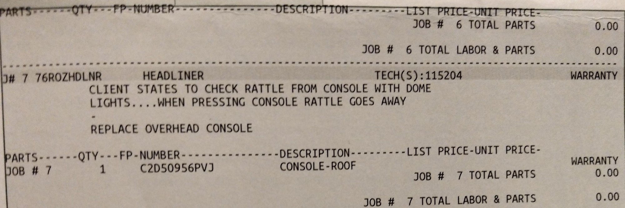 Wow! Your dealer replaced the main roof console component for a rattle? That is diagnosis by replacement at it's finest. Given you need to remove and transfer all of the ancillary components when you switch out C2D50956XXX you would fix the cause of the rattle while transferring them.