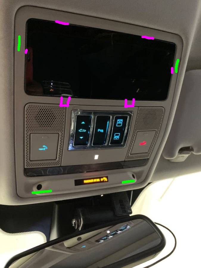 Remove the roof console from the rear sides where the green clips are using a bent pry tool or a kitchen fork. You have the cloth headlining in that photo, but worth noting if you have the leather headlining then be sure to use a credit card or similar behind the pry tool to protect the leather else it will get scratched.