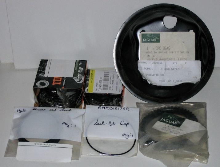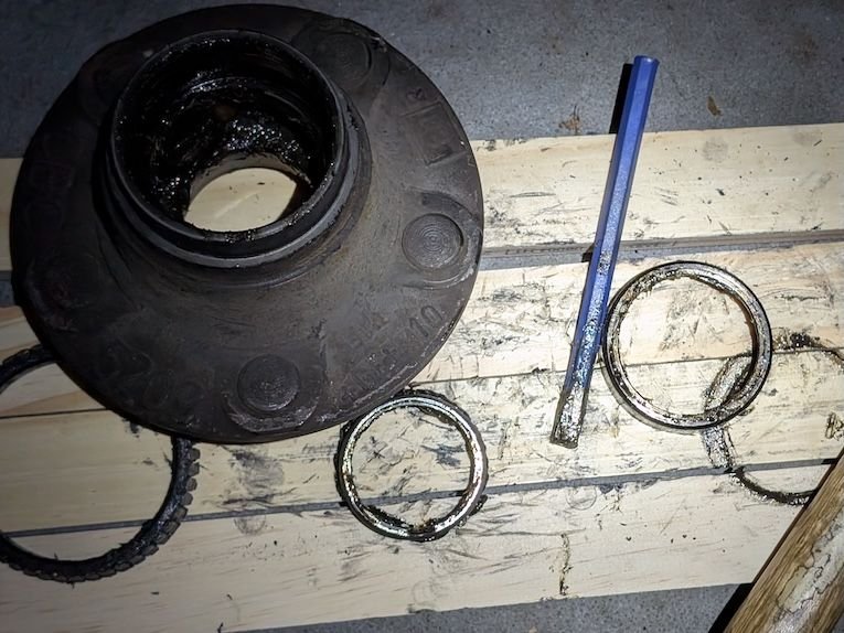 I addressed the RF hub today, which was starting to whine a bit. Also rotated the tires front to back while I had the wheel-offing tools out. Old ABS ring knocked off without too much trouble. Outer races got pounded out similarly. New ABS tonering seated. New water shield installed, spindle cleaned and ready to accept new seal and bearings.