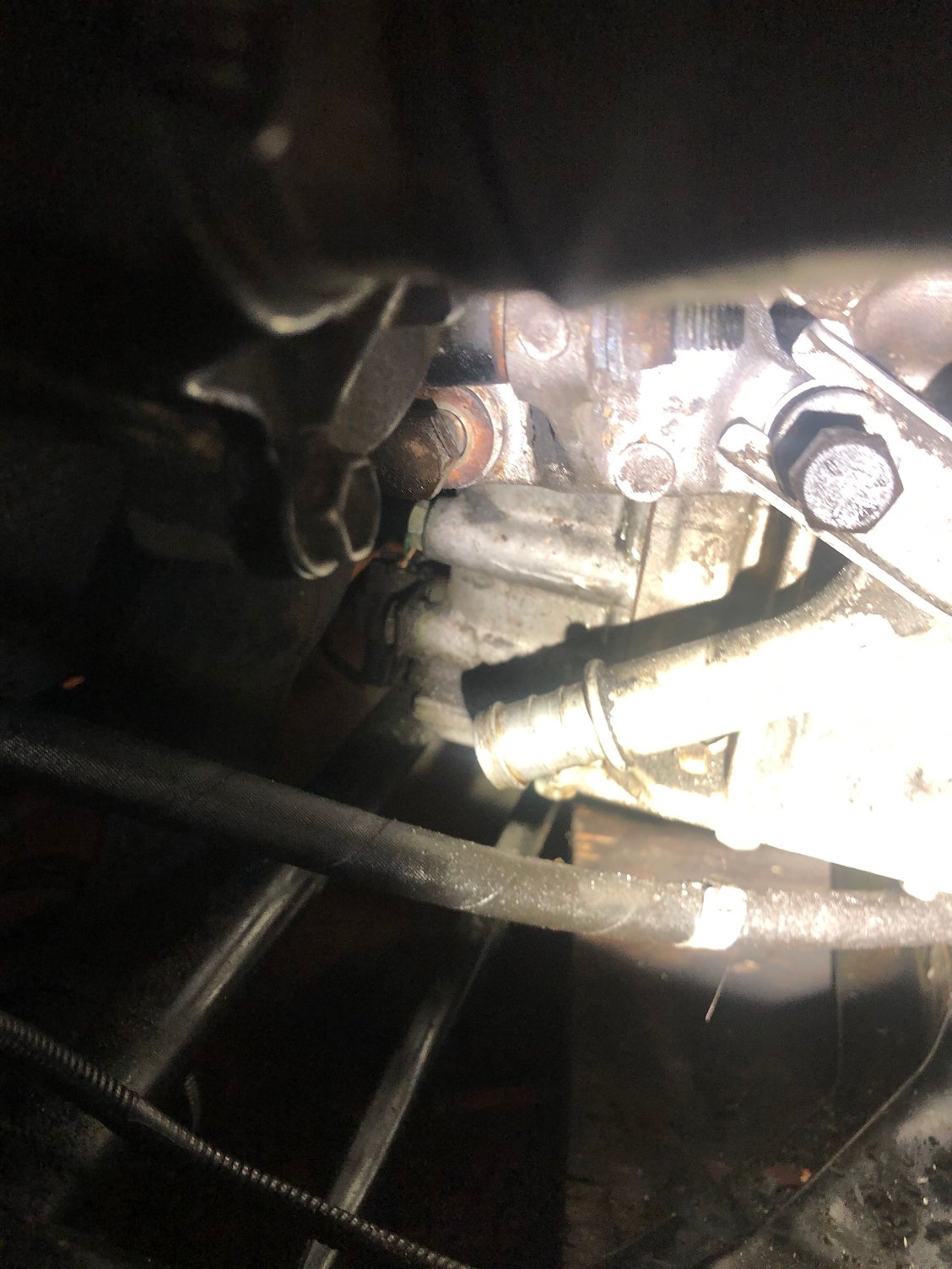 I began the investigation soon after returning home on the flatbed. The oil filter was intact. I couldn't see any source of a leak anywhere, even after removing the left front wheel. I added more oil and started her up to make sure no damage was done due to lack of oil. The engine idled just fine, but the oil was gushing out! What a mess. Next day, I disassembled the left air intake and air pump hoses to look deeper. I eventually discovered a small hole in the top of the oil cooler hose right near the exhaust manifold.