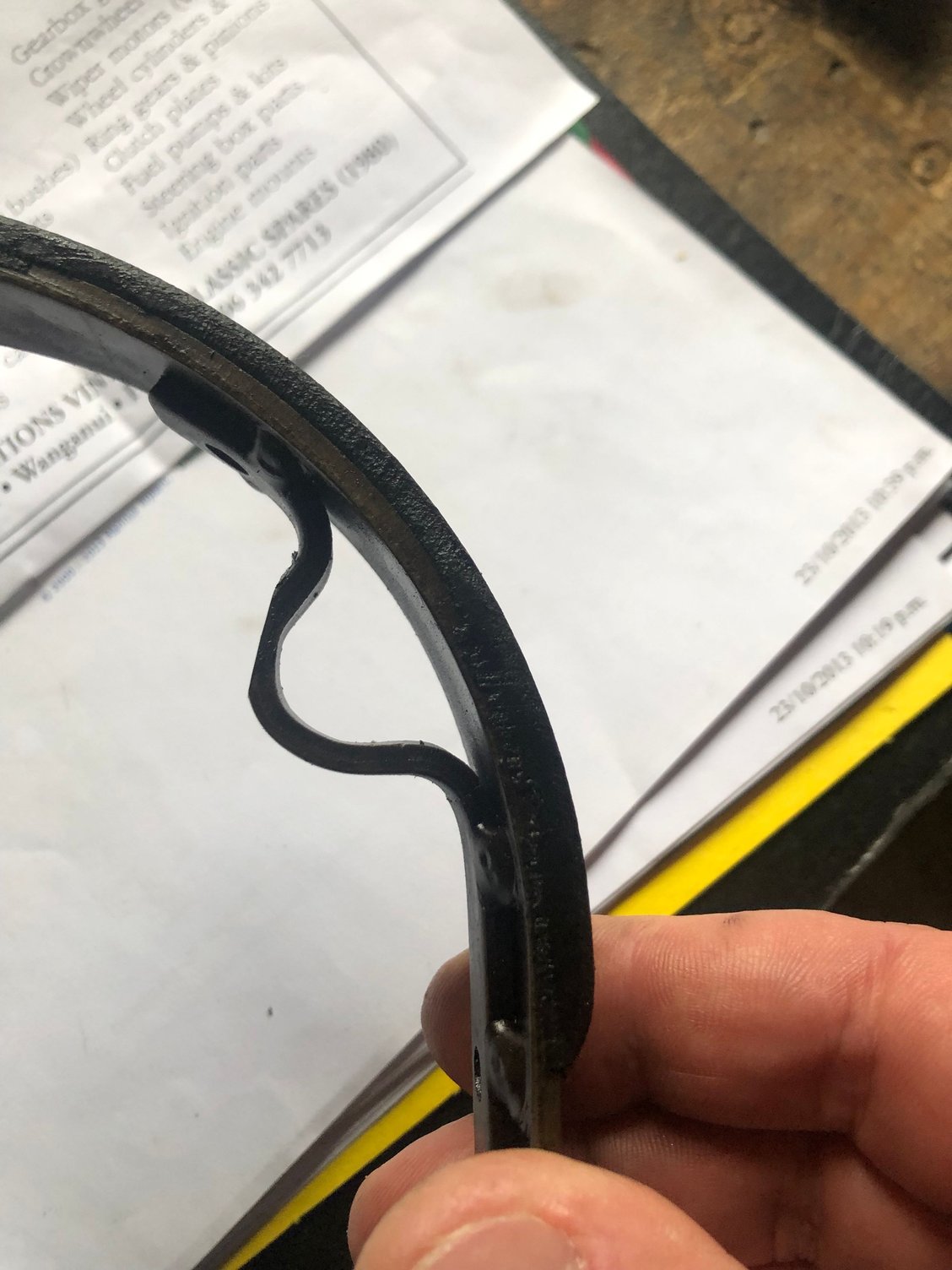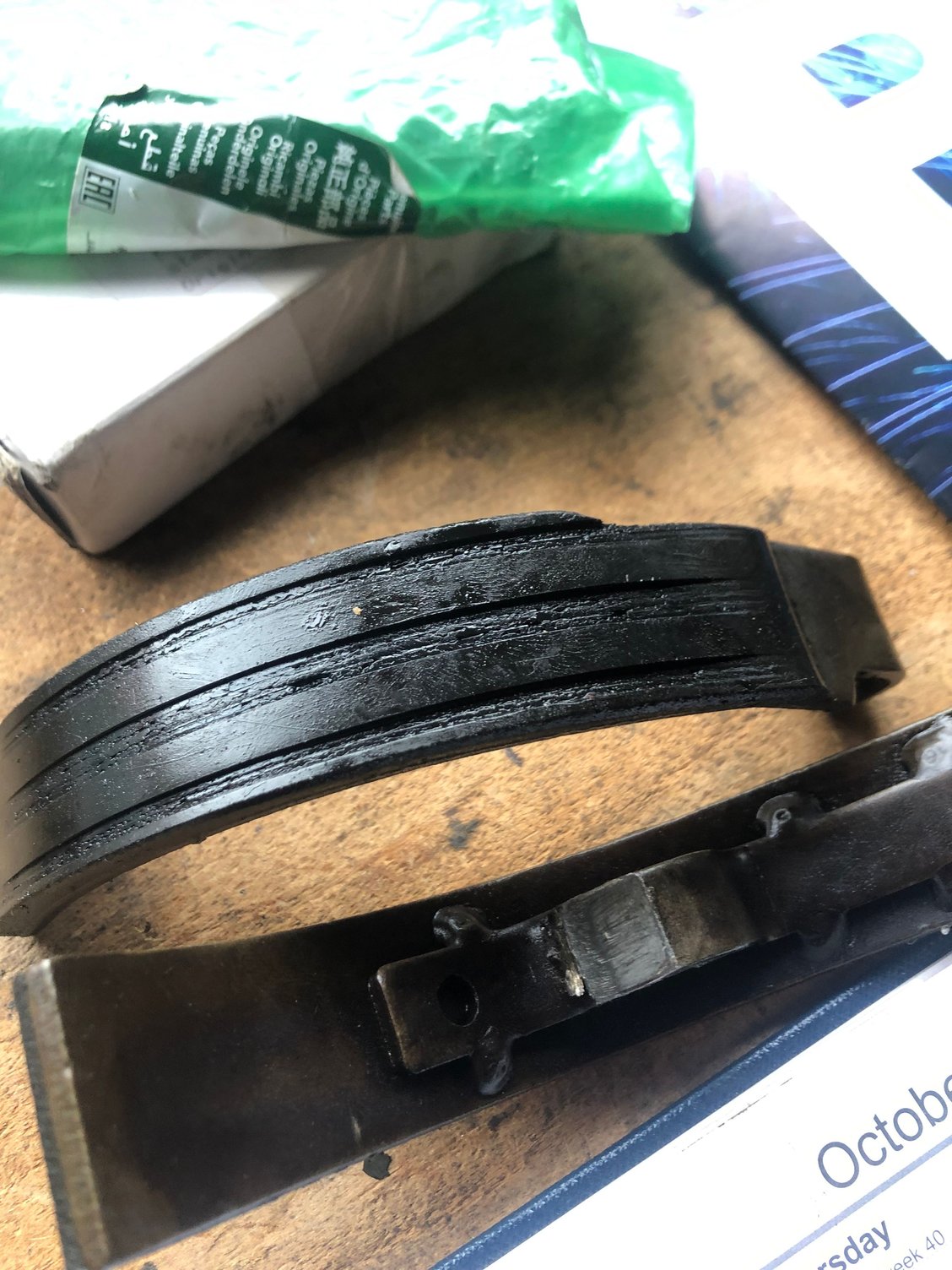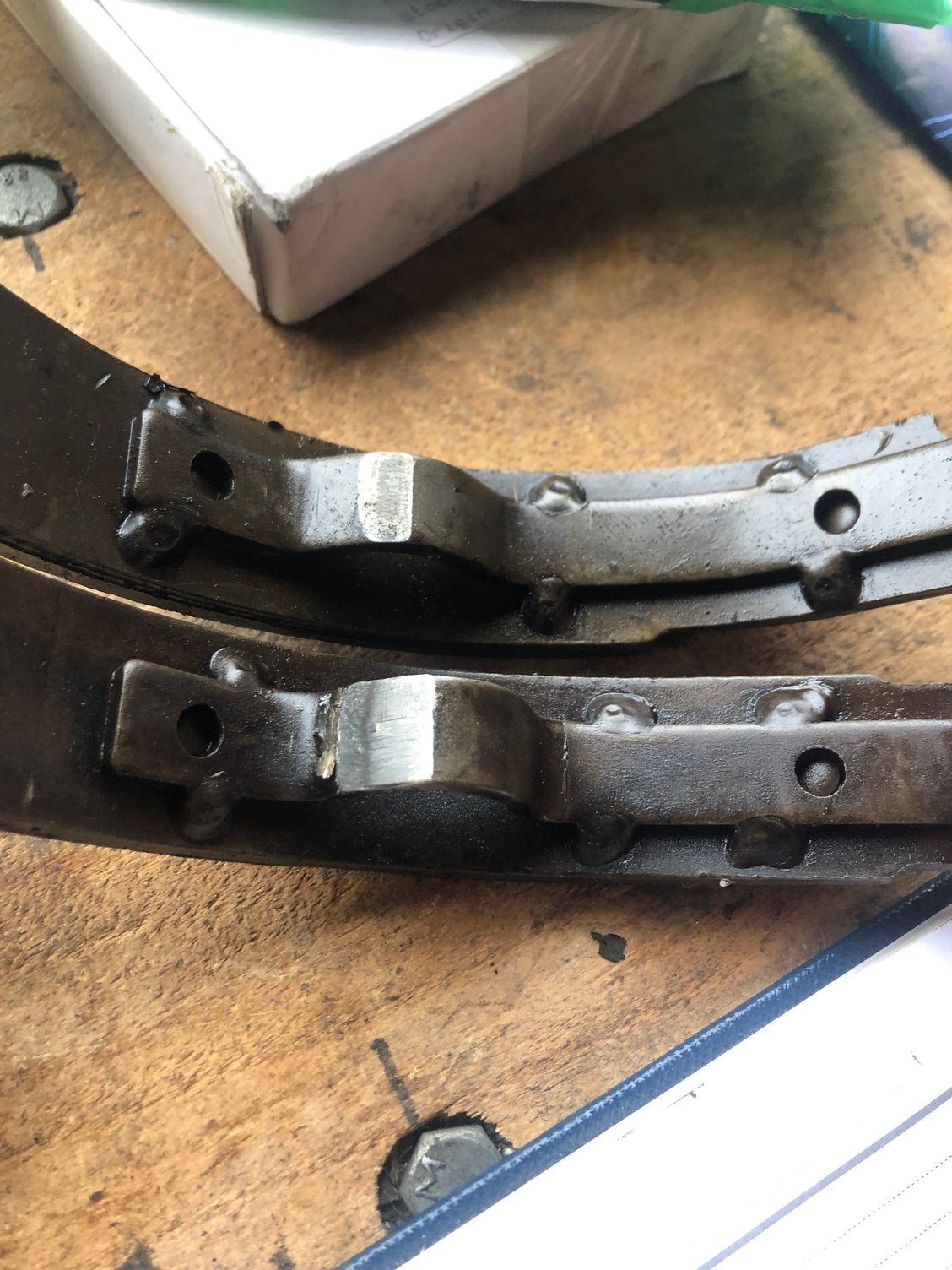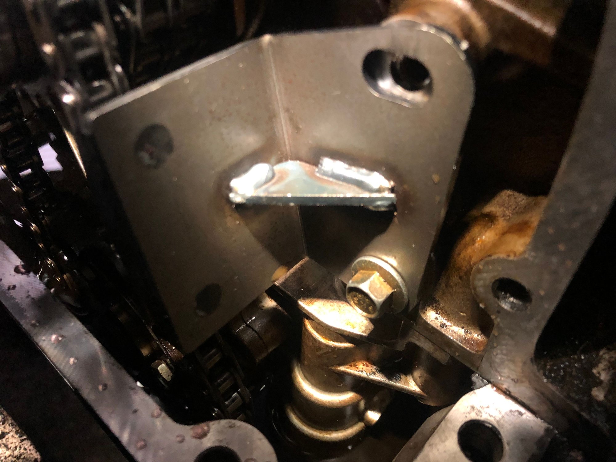 these photos show the wear in the old chain tensioners, and a new genuine part which is poorly made. It is the tensioner for the chain to the oil pump, and is photo’ed next to the original. The welded triangle brace replaces the pressed one-piece original. It came in the genuine parts bag shown. My mechanic thinks the welds are poor and will not install it. I am going to attempt to find a better one on eBay.