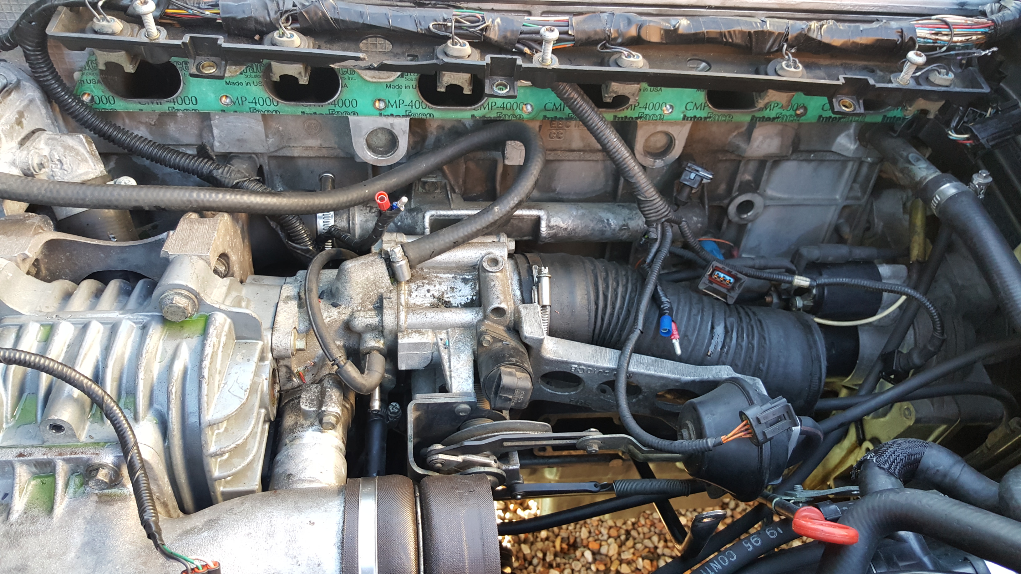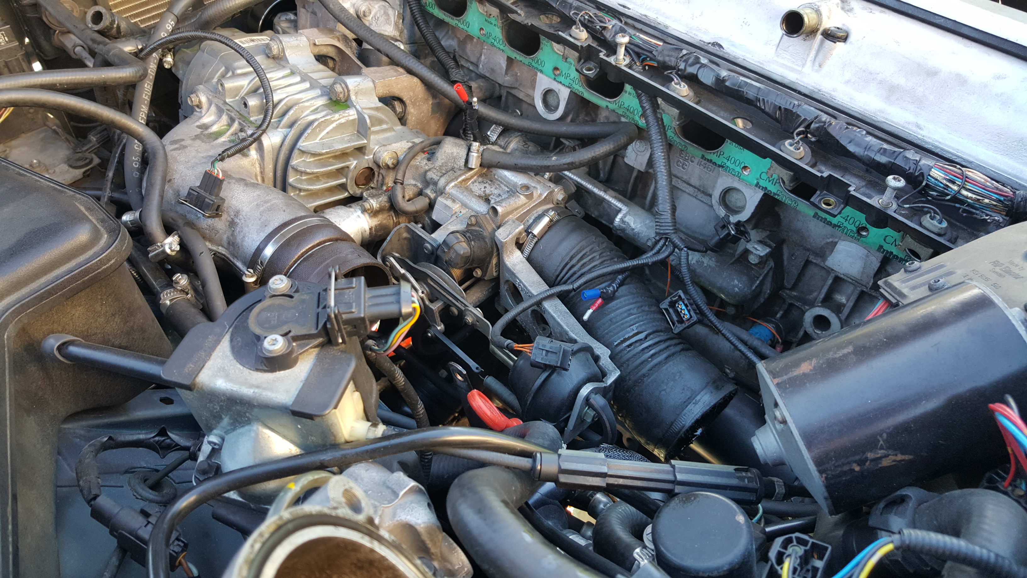 BTW, I also see that you are missing the connection of another vacuum line right below the vacuum line that coils over the bypass valve body to actuate the SC bypass valve. See the bare "gold" nipple/barb? That nipple/barb should have a vacuum line attached that runs back toward the firewall. I'm not sure what that vacuum line supplies off-hand, but perhaps cruise-control. If you just took it off, no worries, but I saw it was missing and thought I'd call it out. With no vacuum line attached, you'll have a heck of a vacuum leak and unmetered air entry.