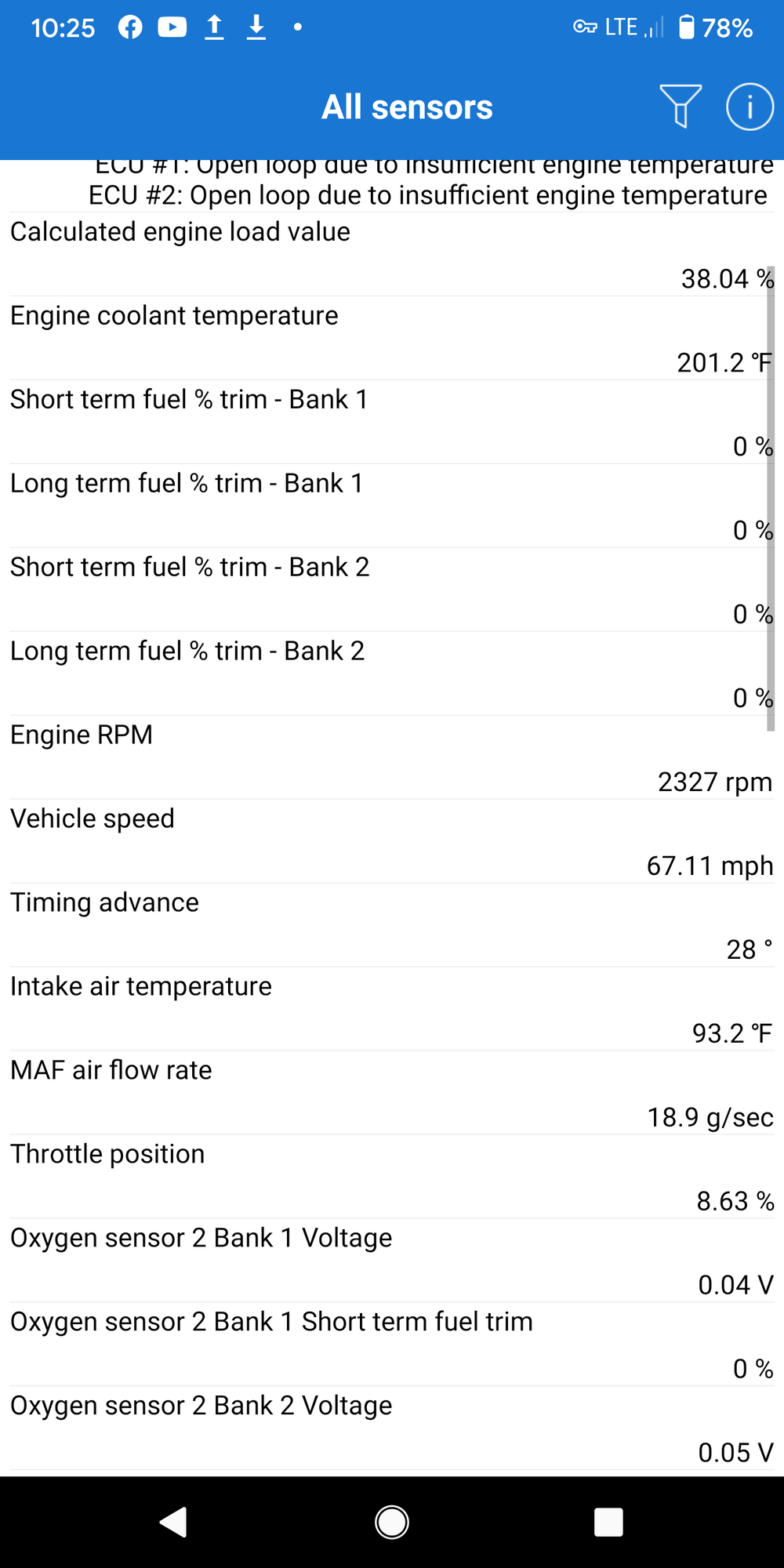 10) with my OBD2 ELM scanner I can monitor the upstream O2 sensors voltage. Both are varying between .03V and .9V.