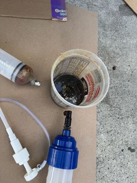 I got it out, and the fluid is pitch black, stinks and is thick. Very much like, well can I say this? Diarrhea. Much worse than any used motor oil. Taking a break, and will fill it up in a bit. I have some anxiety about aligning the top two rollbar bolts- planning to use the jack and do whatever manuevers I can to get the holes to line up. Any other way to do that?