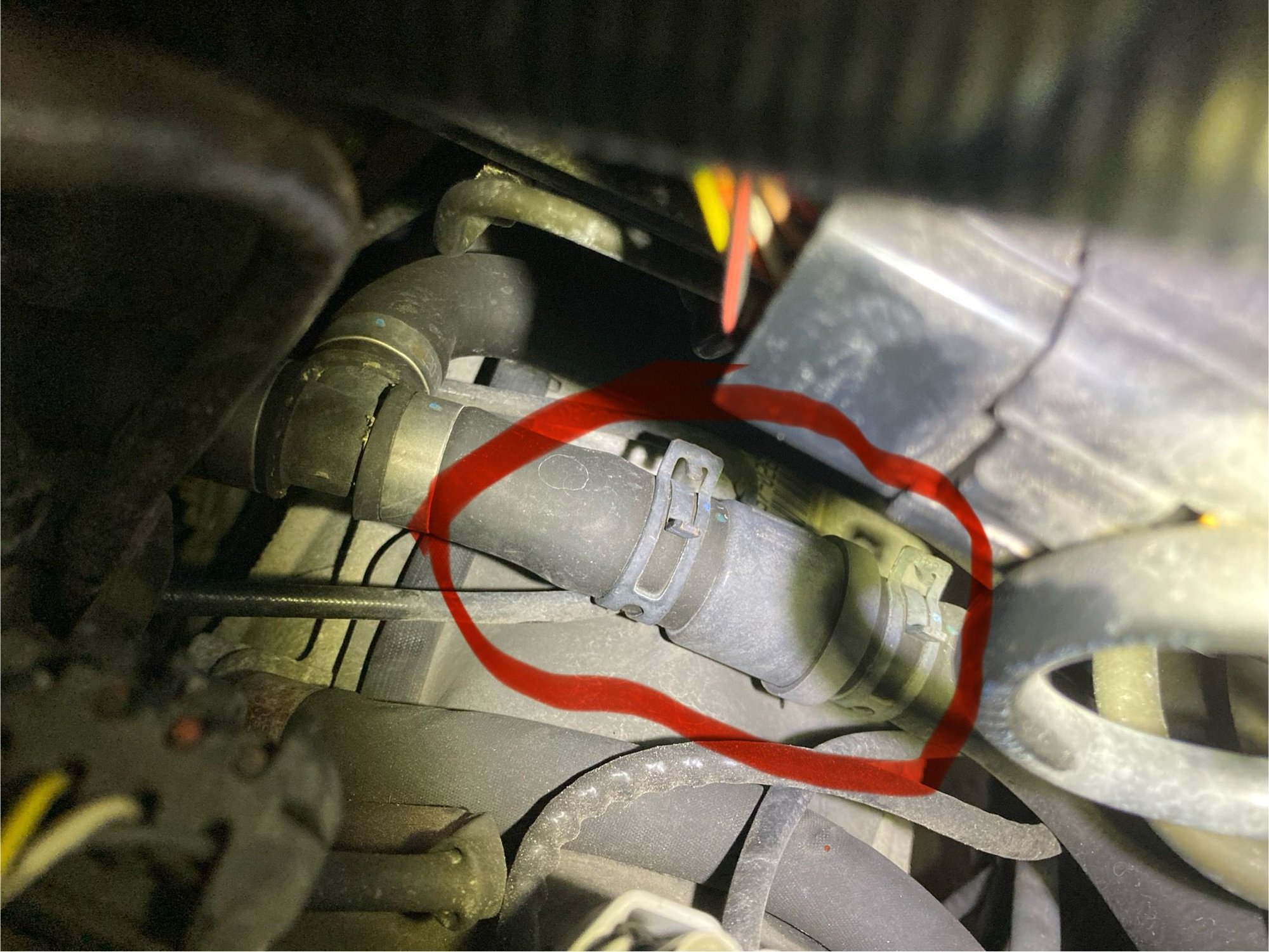 Below the throttle body on top of the transmission is this plastic one way coolant valve. It’s part of the octopus hose. They develop cracks, slowly leak coolant on top of the hot transmission and can evaporate the coolant prior to hitting the ground. On the passenger side of the engine bay is this quick coupler. It to is also part of the octopus hose. It can crack and drip coolant on top of the passenger side catalytic converter and evaporate the coolant before hitting the ground.