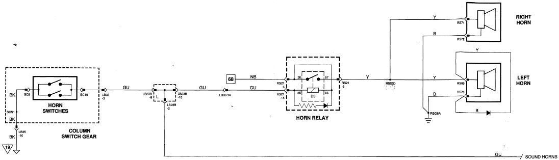 The relay coil is activated either by a horn switch in the steering wheel connecting to Logic Ground, or the Security System ECU grounding the Green wire with Blue tracer stripe (GU).