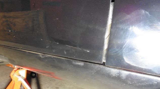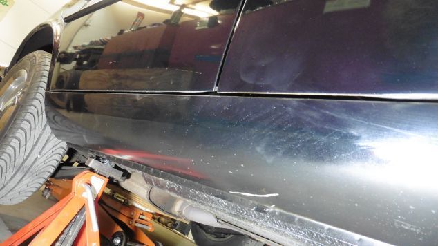 After hitting the cross member whatever it was, slid along the right side of the car, digging a gouge and various scratches in the right rocker panel at about the B-pillar, then jumped up and scuffed the right front door and scratched the rear door chipping off the clear coat.