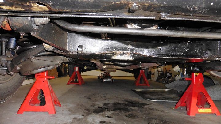 AHA!! I'm familiar with Vise Grips, and although I'm sure we don't have one, I know what a monkey wrench is. For the time being though, we thought of leaving it alone as it's not hurting anything as it is. Or, now that we're proficient at dropping the cross member, getting one from a wrecking yard is not out of the realm of possibility. But not today.