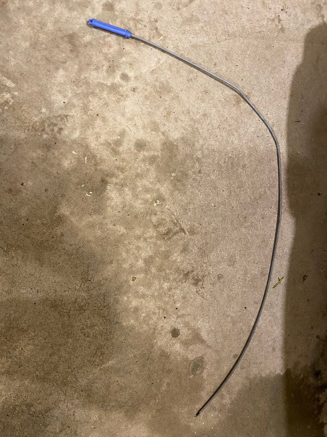I took a quick trip to Canadian Tire (a north of the border institution) and spent $5.99 plus tas on a 1/4" drain auger. Unlike it's too big cousins, it's rubber or vinyl coated and I just snipped off the brush that came attached to the end. I can thread it a little over 3' into the drain from the opening at the back of the gas cap and then it gets "stuck". Can't tell if that's where it's blocked or if there's a bend at that point that's too sharp for the auger to turn (there were two before then that took a bit of prodding). On the first attempt, it did empty a bit of water behind the wheel but it still doesn't drain. I used a bit of dish soap to try and help the auger slip through but decided to just leave it for now.