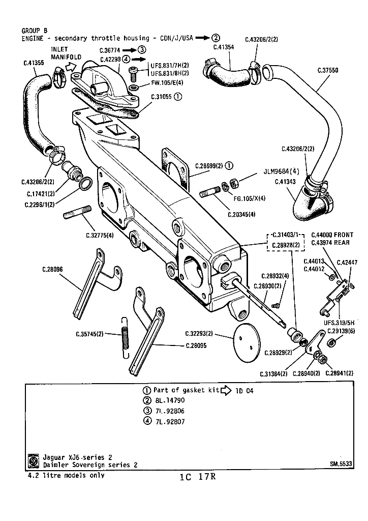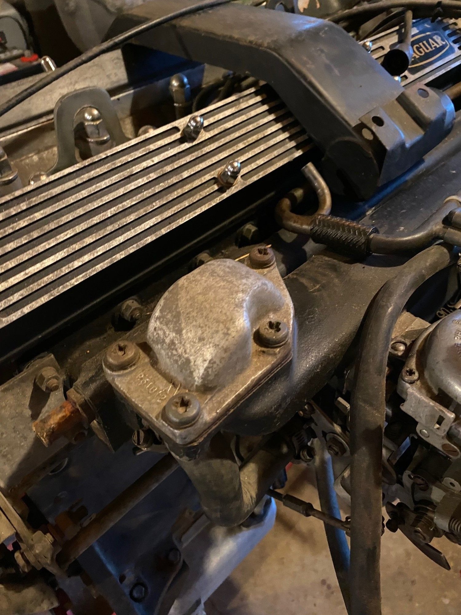 I think this is a leftover secondary throttle manifold that jaguar used until gone, when a new design casting was then installed. The Cap is to return idle air mixture to the intake path after being warmed to improve vaporization >>> an attempt to meet USA smog rules in the late 60's or early 70's.