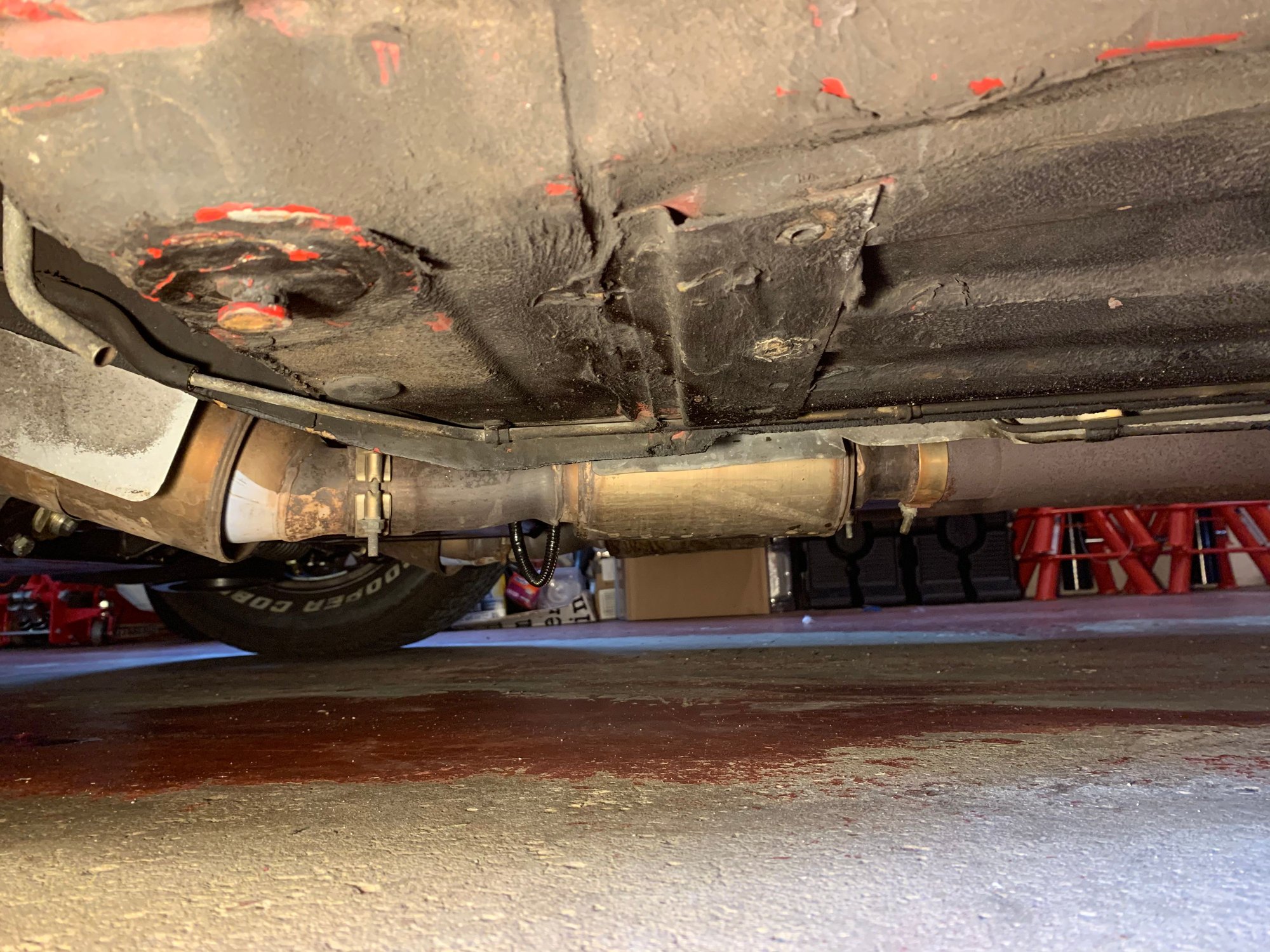 Just something that caught my eye in this. That covered wire hanging down I think is the rear CPS cable... It can and will come into contact with the very hot area just after the down pipe, melt the insulation and short... The slack can be pulled up from the top and zipped to the cross pipe, and below the cable/wire and covering can then be zip tied away from the pipe to a small hole, I'm guessing designed for this purpose, in the area of the inspection cover at the bottom of the bell housing.