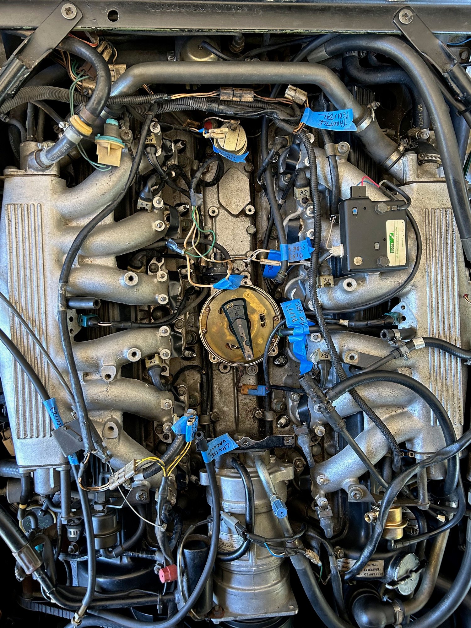 A couple of pics of the work so far. You can see the difference in cleanliness between the rear and front of the "V". Also, I label EVERYTHING that is removed and take pics of everything I do. That's ay so may blue tape labels.