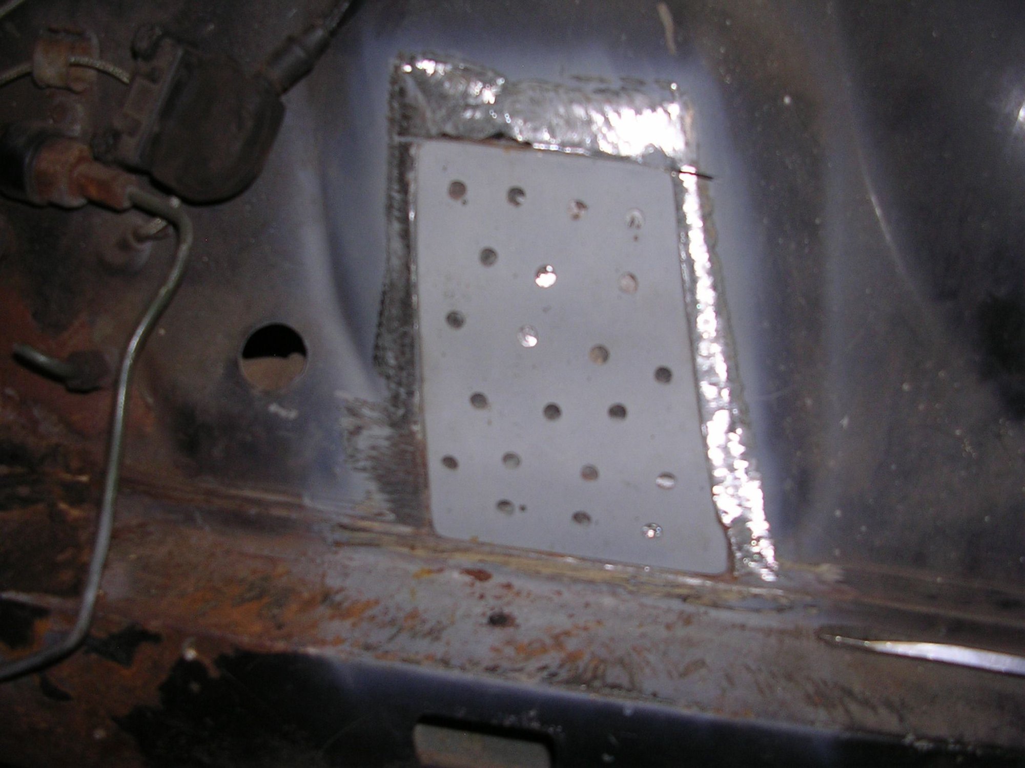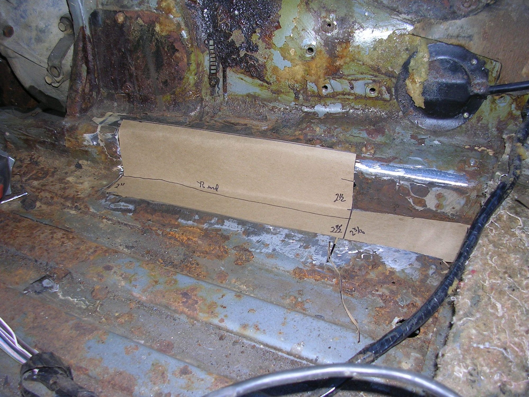 Well a little more work on the drivers floor. I decided to leave the original floor in place, and lay a full 1/16 thick sheet over the top of it. I cut, and shaped it, then cuts slots through it to correspond with the raised ribs in the original floor sheet metal. Then I welded into the original sheet metal, and tied it into the new sheet metal, to create a 2 layer floor. Which has accomplished 2 things. I didn't disturb the car by removing the floor. Thus there is no chance for any movement of the chassis, such as twisting or distortion. 2 it has greatly increased the strength of the floor, and the over all structure of the floor pan, as it is also welded into the thicker / heavier sheet metal along the trans tunnel, rockers, and the front floor where it meets the fire wall ahead of the pedals. As I said before, I'm overbuilding this car because I know how I'm gonna drive it! Here's some pics! Cleaned and repaired floor, it's intact for the most part with several soft spots. nothing to bad but definitely not as strong as the day it was new. New floor cut, and shaped. Working on making the slots wide enough for the Mig wire to go through and attach to the original floor for good penetration and to tie the 2 floors together, instead of just a spot weld. I used a jack, and piece of 2 x 4. to push down on the new floor, and one from underneath to make sure they were touching, before welding them together. A little cleanup and some more primer. 1 floor done 3 to go.