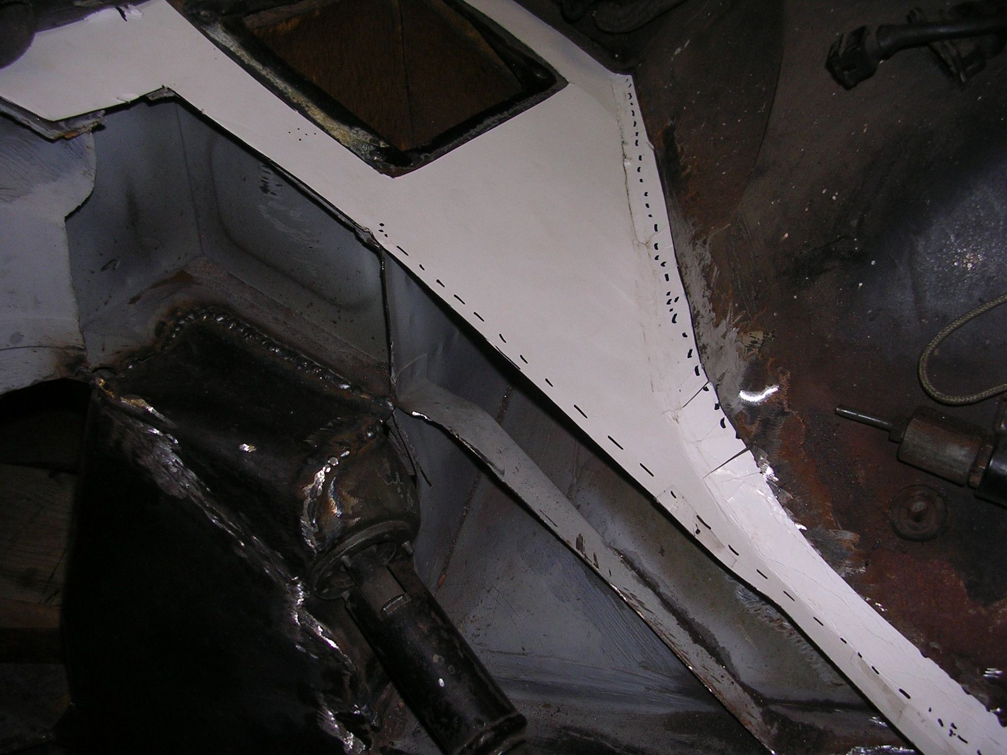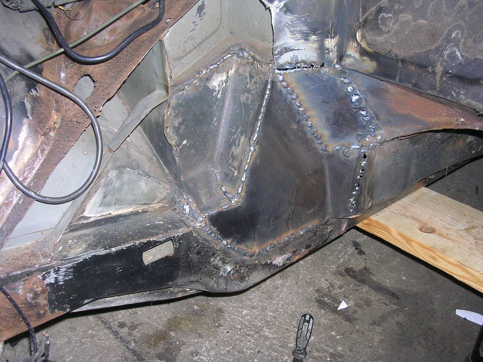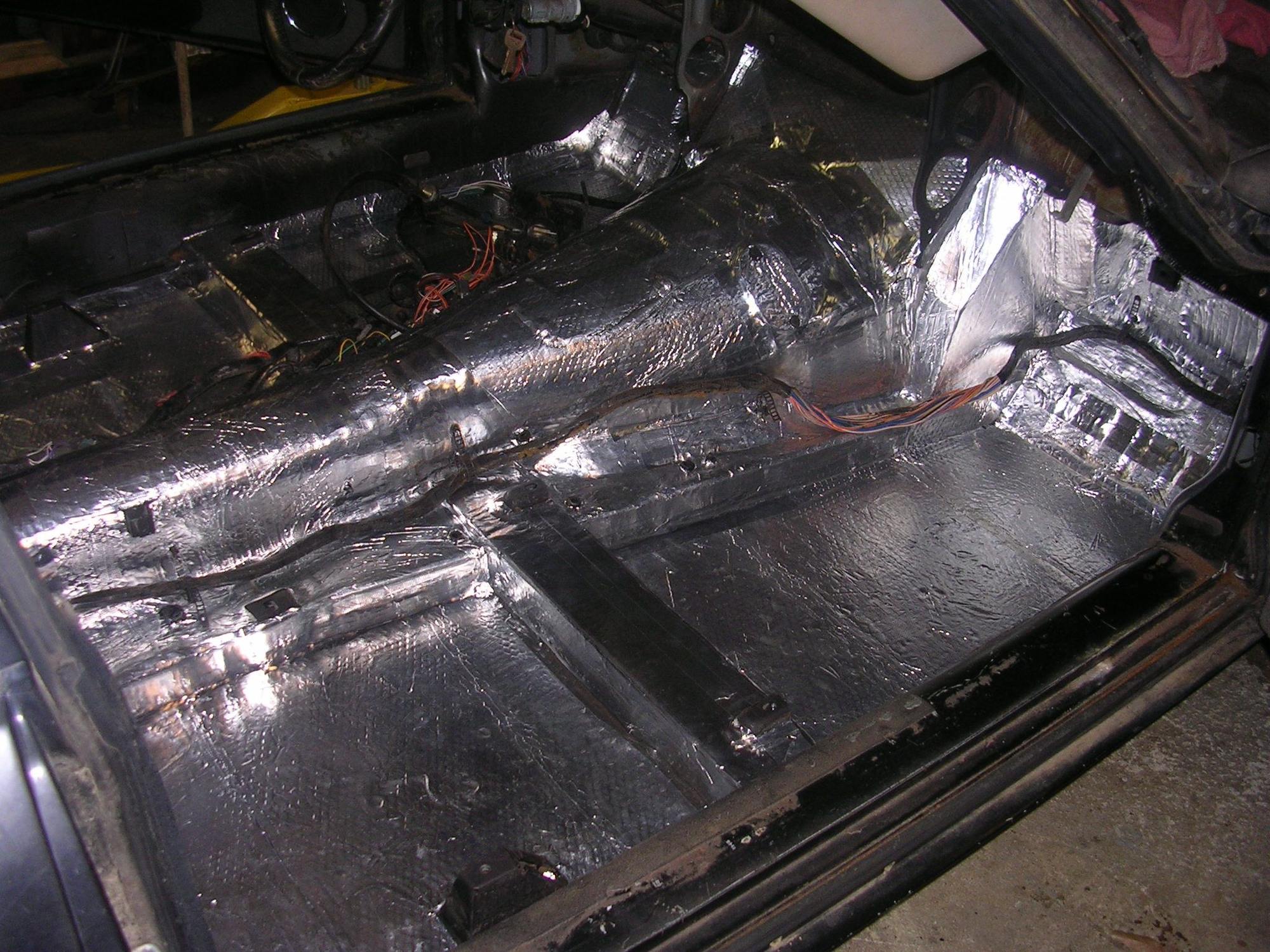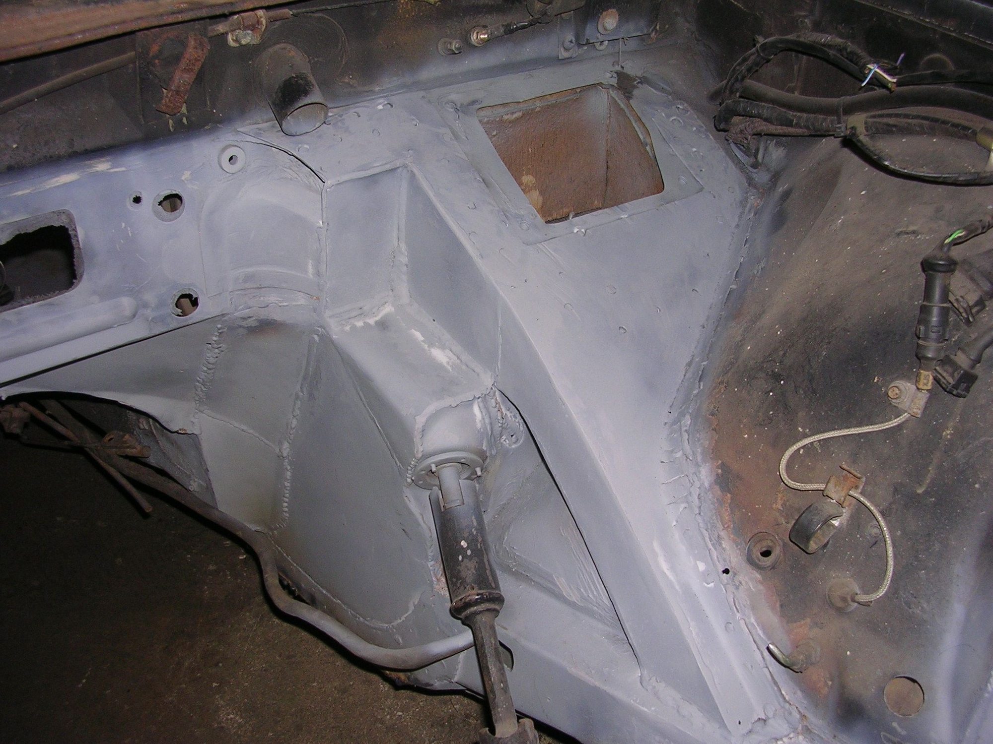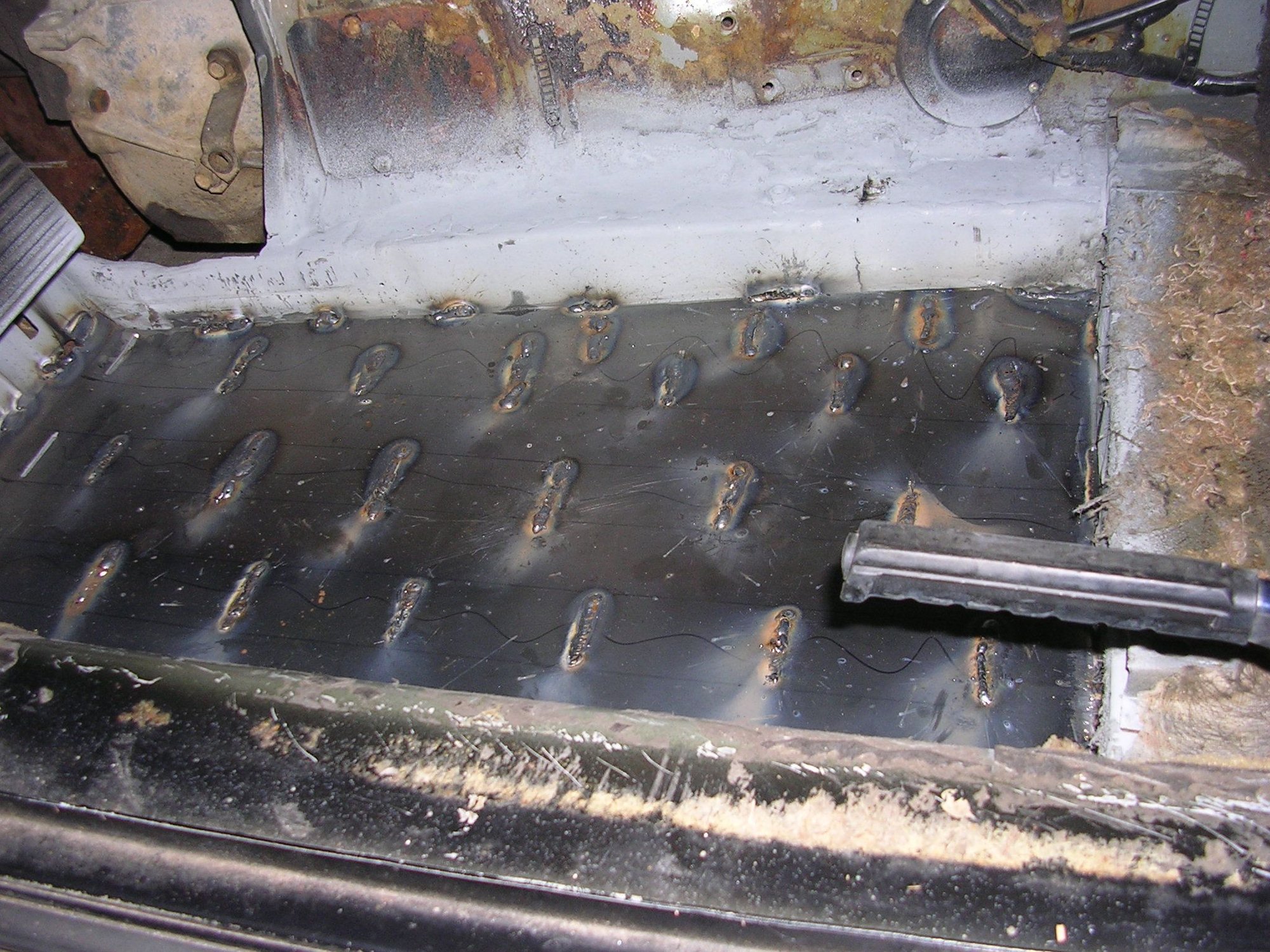 Passenger / right side all welded in 1st coat of primer Drivers side all welded in and primed A look down the hole! Interior floors all welded and sealed shut. Sound deadener / insulation installed Drivers side all done.