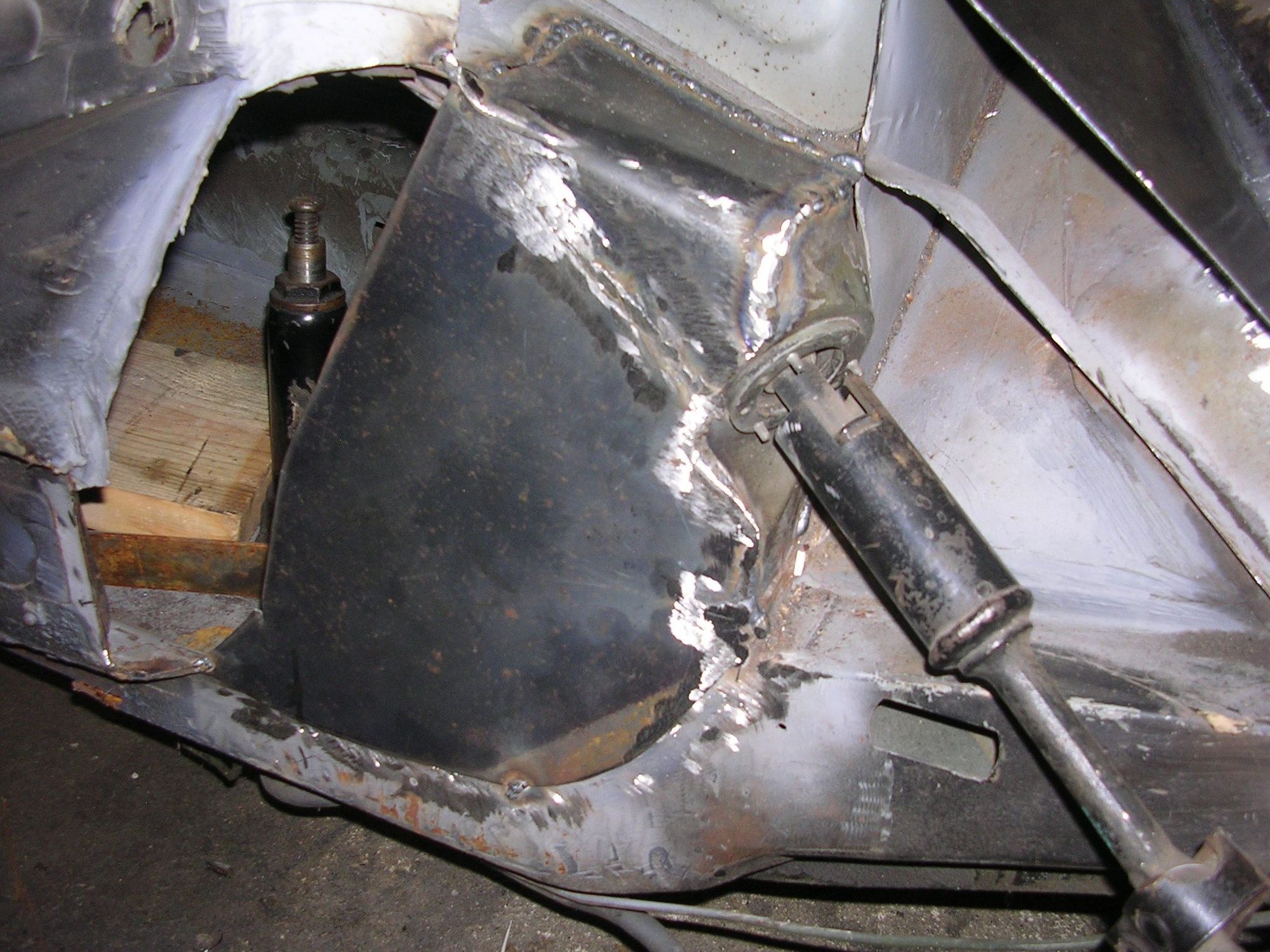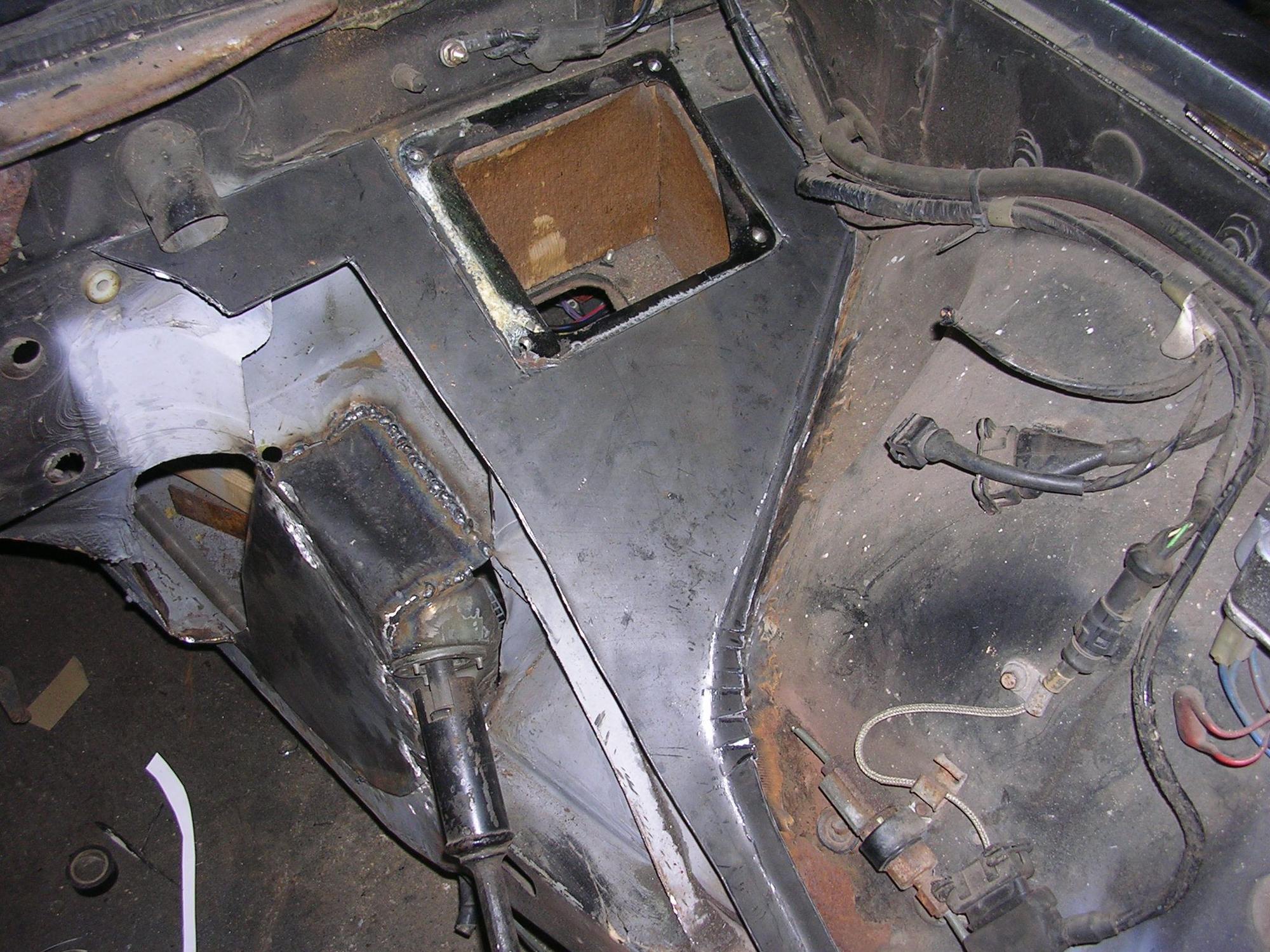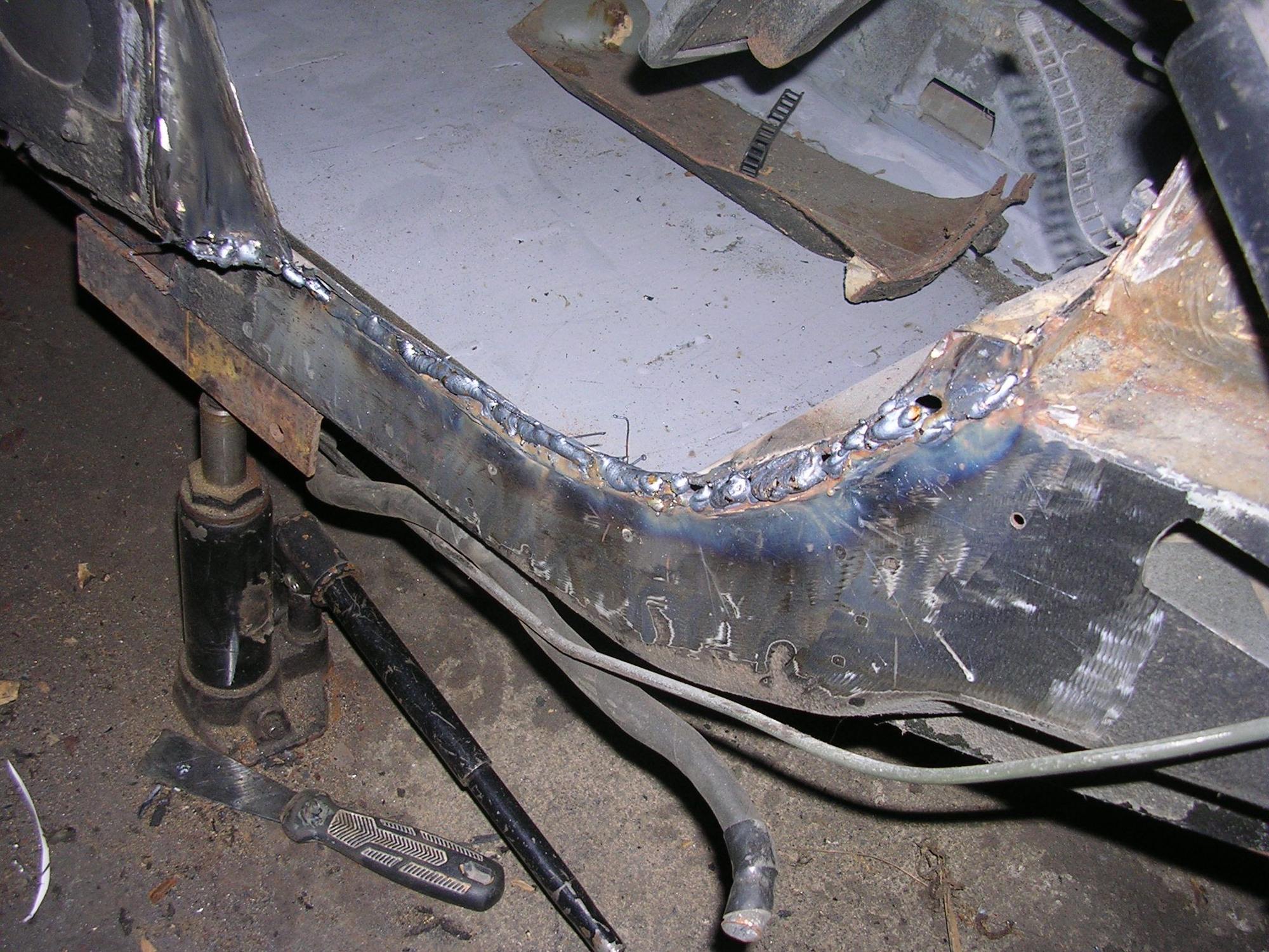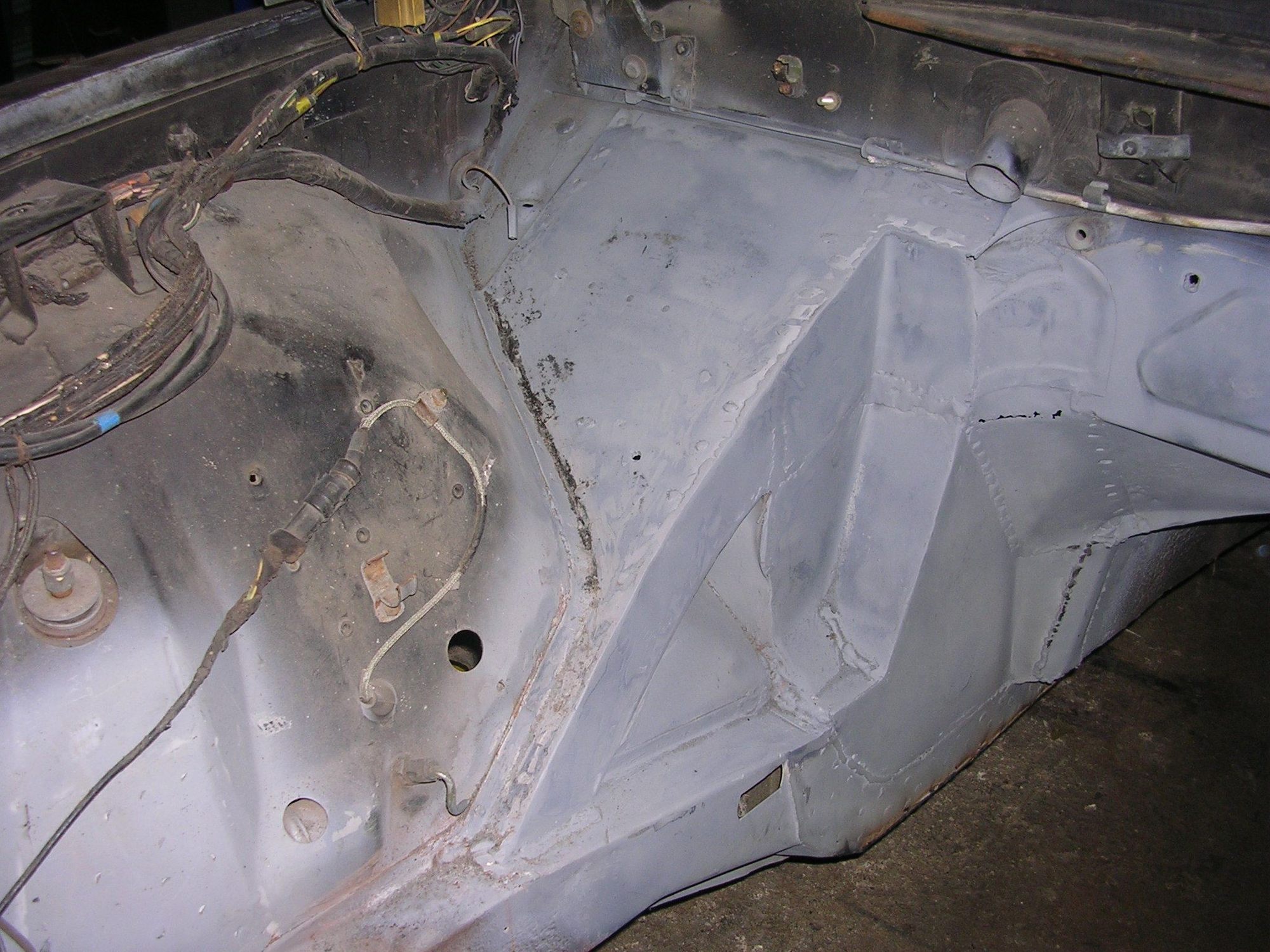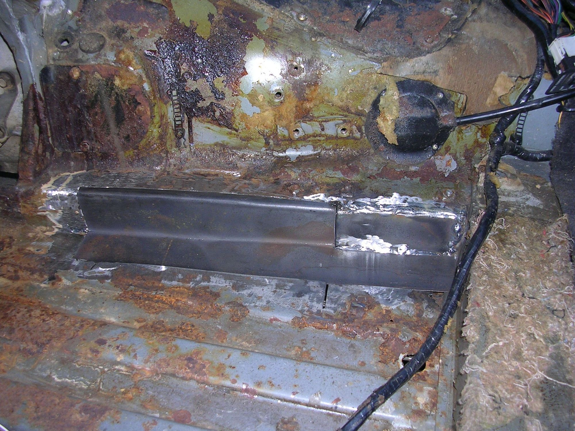 Passenger / right side all welded in 1st coat of primer Drivers side all welded in and primed A look down the hole! Interior floors all welded and sealed shut. Sound deadener / insulation installed Drivers side all done.