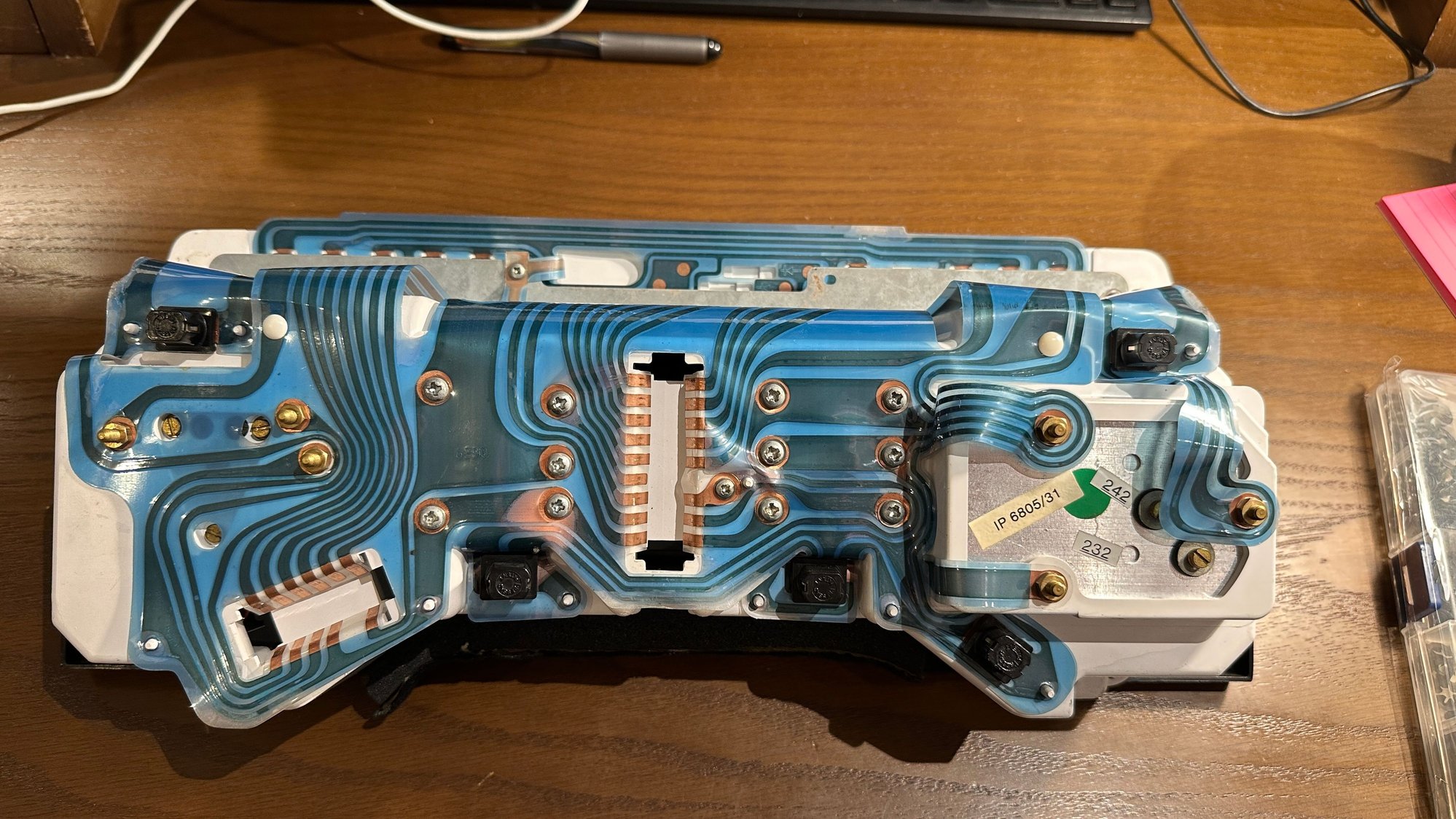 To my surprise the back of the cluster looks very clean, however there is some warping of the circuit board around the screws on either side of the main plug in at 3/4 o'clock and 8 o'clock (and at the edges of the cluster) and some discolouration of the printed board. Does anyone know if these issues would cause the problems I identified and if an a simple cleaning will suffice? I will test all the circuits, upgrade the green lights (which were ok actually) and re-earth the whole thing as covered elsewhere in any case, but any specific diagnosis most welcome!