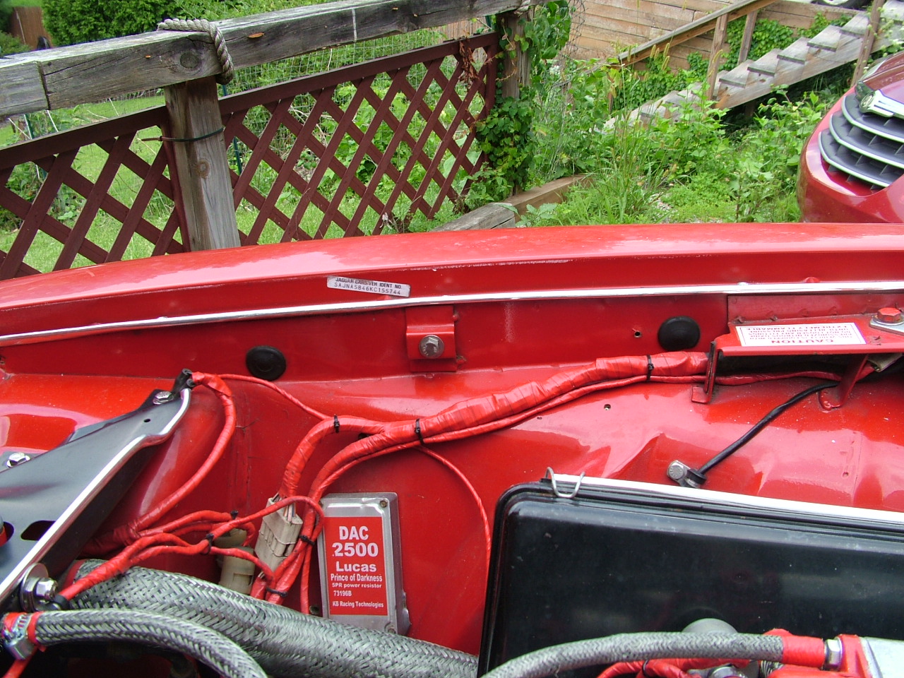 Re-moving the struts was the first part with the hood/bonnet. Then that black plastic piece in front of the secondary coil had to be re-moved because the grill hit it when I raised the hood. The hood now sits wide open, but I put a piece of S.S. tubing in it so the wind won't slam it closed... A little tip - anyone ever try to find S.S., or chrome bolts for a V-12? Look what's holding down the fuel rail in the last picture!