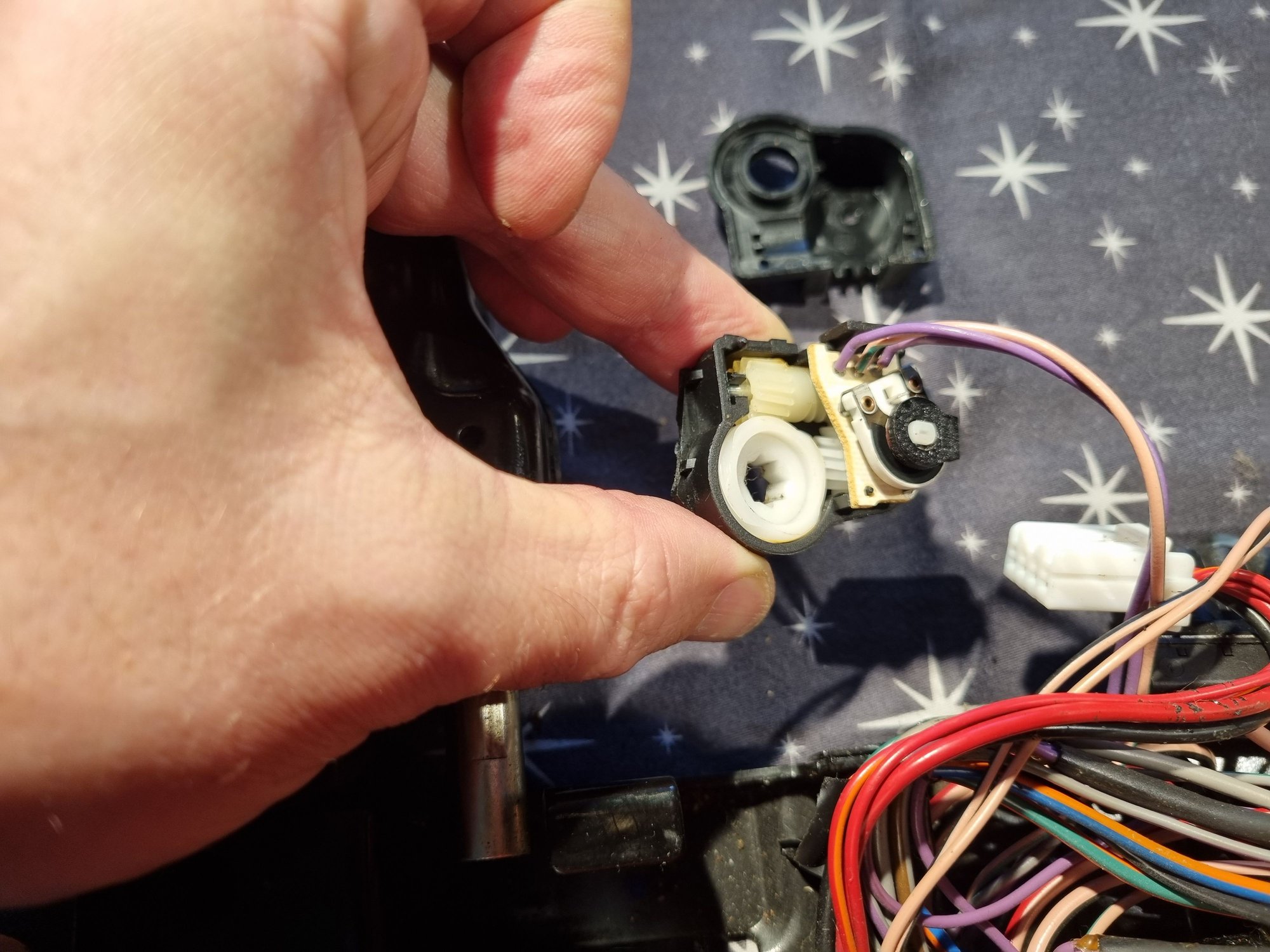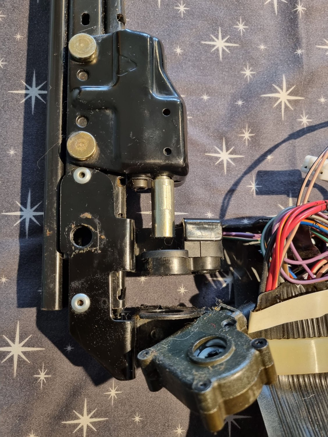Now you see the troublemaker, the part that is connected with wires. Pull it carefully out and you will discover the design flaw of this part. It has connecting shaft inside and the little "arms" of the shaft are broken. The plastic will not tolerate the stress of the tensioner metal ring and eventually it brakes. After that it cant turn when seat is moving and potentiometer electric value is not changing. The seat memory control unit detects that something is not wright and is not allowing the movement and seat memory to work because of that. The result is inch by inch movement of the seat and no working seat memory.